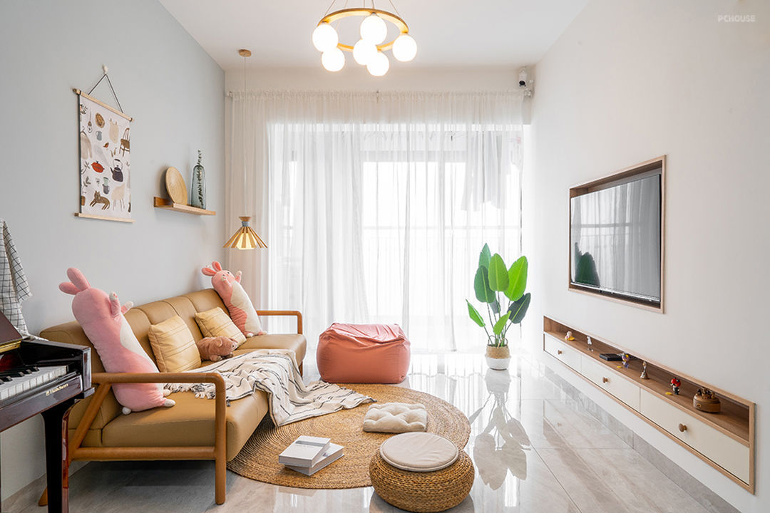 客厅整体空间温暖不失自然,采用浅灰色与木质色彩叠加,给室内带来一种温暖轻松的视觉效果,带来视觉的放松与身心的休憩;落地的大阳台门让空间有了充足的光照,慵懒的夏日午后可以躺坐在珊瑚红豆包里偷得浮生半日闲。