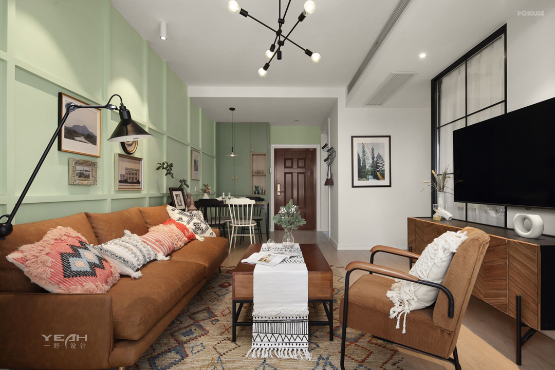业主比较喜欢北欧的那种自在舒适,但又不喜欢北欧的那种大白墙觉得太冷淡,所以空间的很多材质上换成业主喜欢的清爽绿,即契合北欧主题又不会太冷淡,再辅以低饱和度色系的软装打造成一个温馨的北欧小家 ;