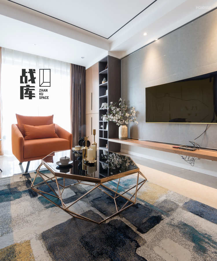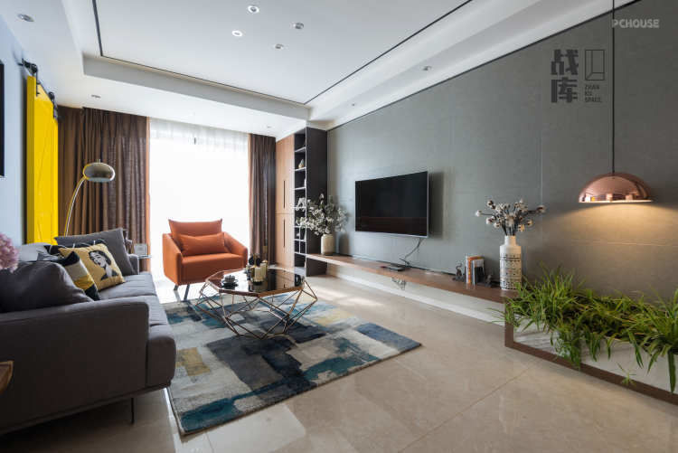 装饰柜使客厅和阳台完美结合为一体,电视台板与装饰柜材质统一,入户开始墙面全部贴上灰色墙砖,给人很强的视觉冲击力,不锈钢收口线条,体现了细节处理。很多人喜欢谷仓门,因为它可独立成为一景并且实用,单独定制黄色门与蓝色墙面形成强烈对比,牢牢吸人人们注意力。