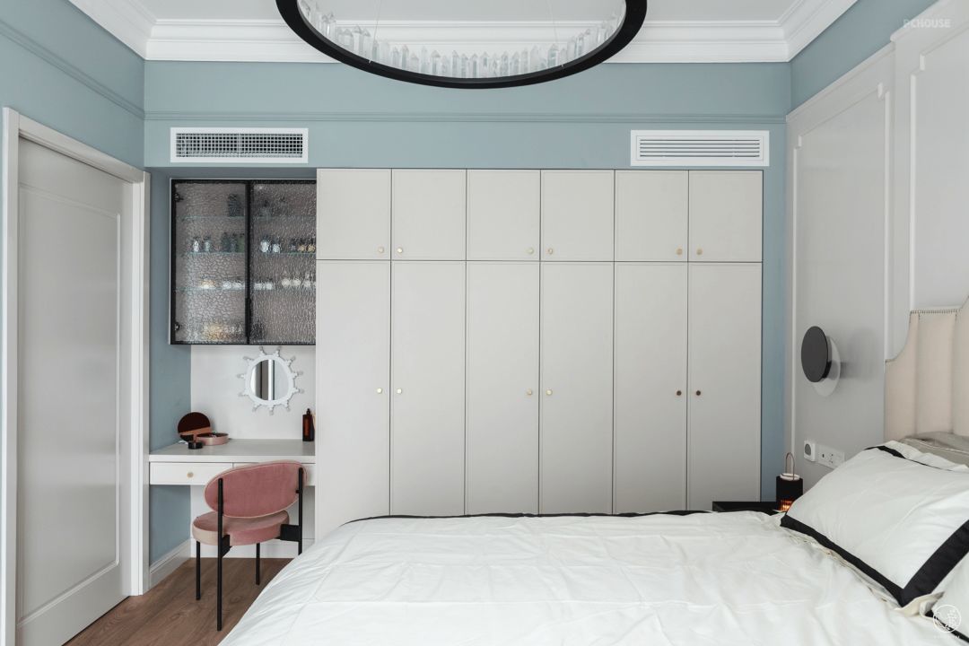 主卧的衣柜是现场定制的,和背景墙的色彩一致,都是质感十足的奶油白,收纳功能很强大。这一次,有别于将整面墙做成隐形收纳柜的常规操作,我们在旁边刻意开辟出了一隅特别的梳妆区,只要打开那两扇黑色金属框镶水波纹玻璃的柜门,你就能窥见女主人的“快乐宇宙”。
