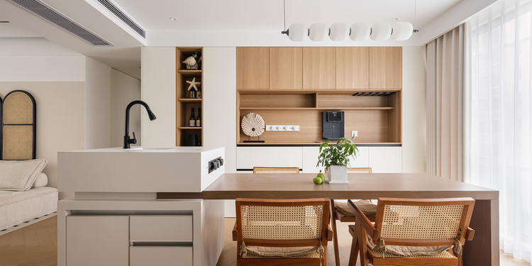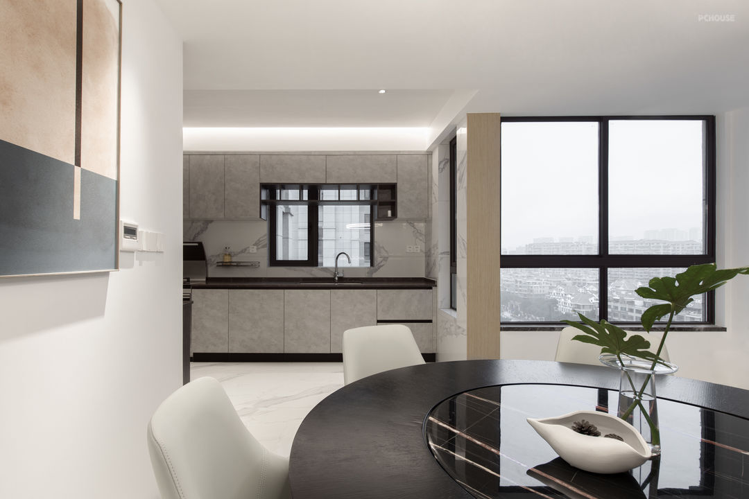 餐厨空间是一个家温暖的所在,阳光微风和孩子的笑闹,是烹饪美食的灵感和配料。餐厅与厨房联合,有效利用公共区域的活动范围与空间层次。最大挖掘相邻场域的渗透与交互,在这里爱与食物都是能量的来源。