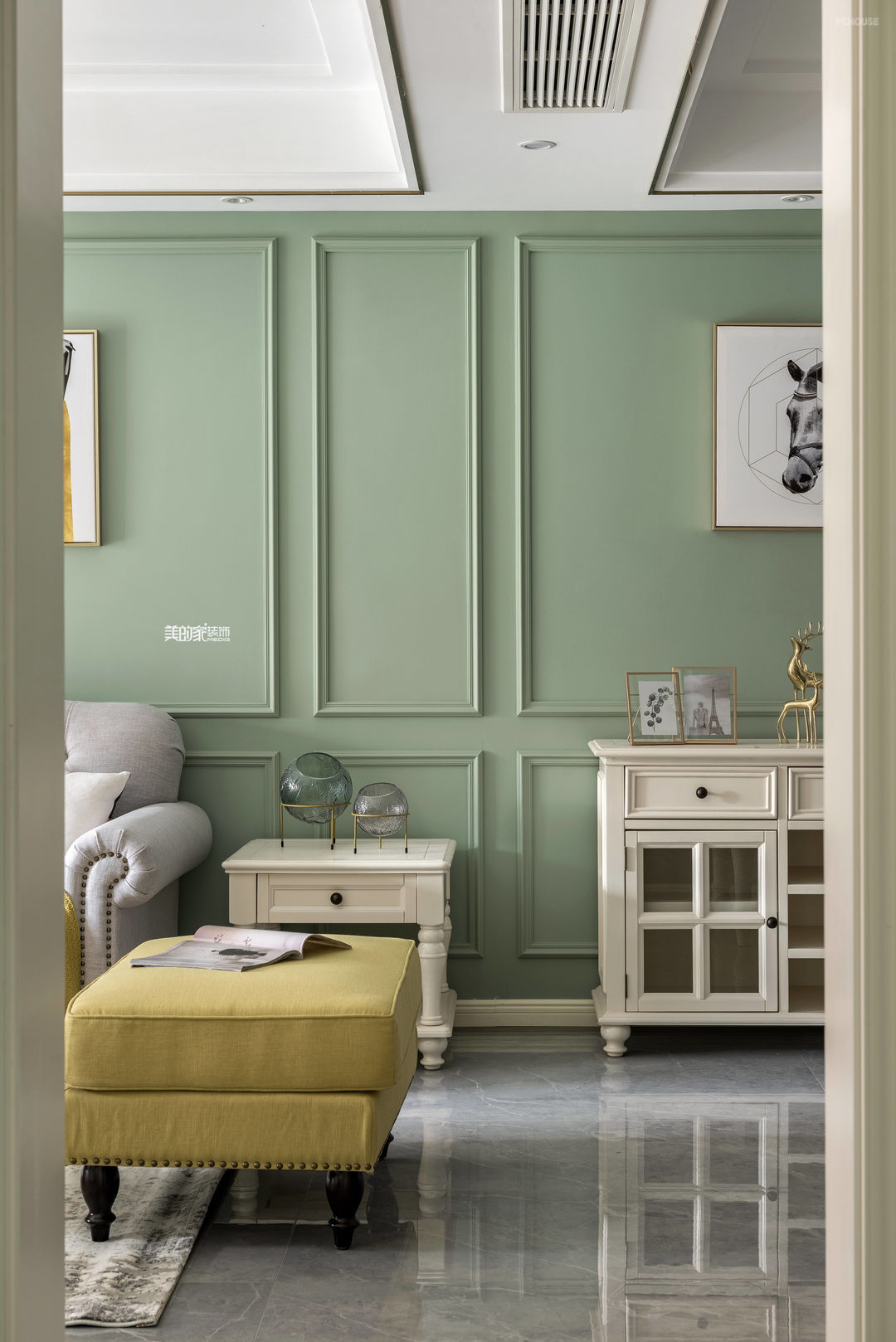 客厅的诗意,还体现在设计元素的形态上。石膏线条的干练利落,美式家具的婉转流畅,不同形状的混搭融合,完美平衡了生活的日常感与精致感