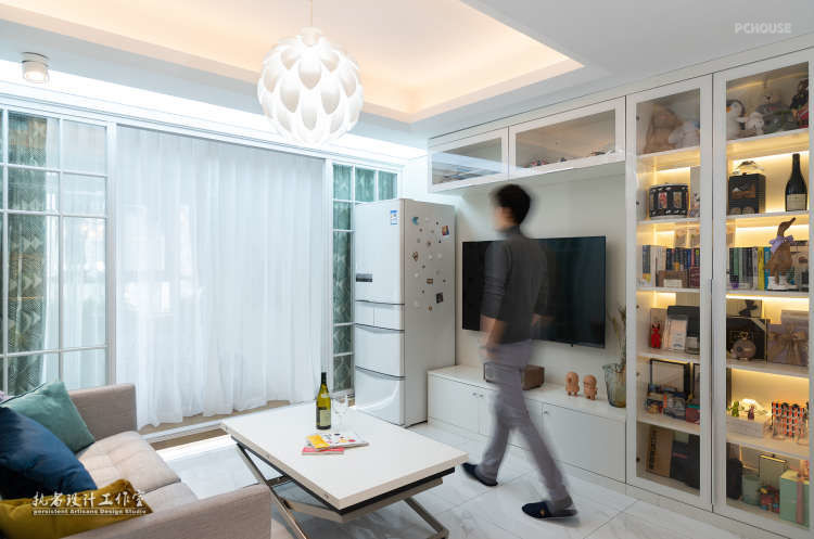 由于空间较小,为了避免空间的浪费,我们在规划时尽可能的减少了那些可有可无的物件,只留下实用的。一张两人沙发足够屋主两个人休息;一个可折叠的茶几,平时当作茶几来用,来了朋友把桌子打开,就可以和朋友一同欢乐。因为厨房也比较小,所以把冰箱也放在了客厅,充分利用了客厅的空间。电视挂在墙壁上,电视柜和壁橱用来充当书柜、杂物柜等,这样就扩大了客厅的收纳空间,再用一些小饰品加以点缀,客厅也变得精致可爱起来。