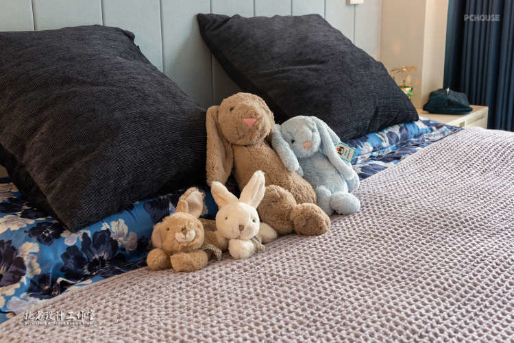 卧室和客厅是相连的,我们利用钛合金移门将两个区域隔开,通透的移门可以顺利的透光让客厅与卧室有连接感显得整个空间更加宽阔一些,同时还挂上了窗帘,让屋主的隐私能得到充分的保护。卧室整个空间抬高15公分,在抬高的空间里只需要一个20公分高的床垫即可,让床架牺牲的空间尽量的给过道使用,这样卧室会显得更为宽敞。床后用的是蓝色硬包做的拼接装饰,淡蓝色能让人感到宁静,硬包材质也有吸音的效果,有助于屋主睡眠。卧室的窗户让卧室有充足的光亮,而且由于卧室比较小,所以夜晚需要的灯光并不是很多,因此在灯光的设计上,并没有按照往常那样将灯具放在卧室中央,而是在床两边的床头柜上吊了两盏灯,既温馨又能满足卧室的照明需求。卧室和