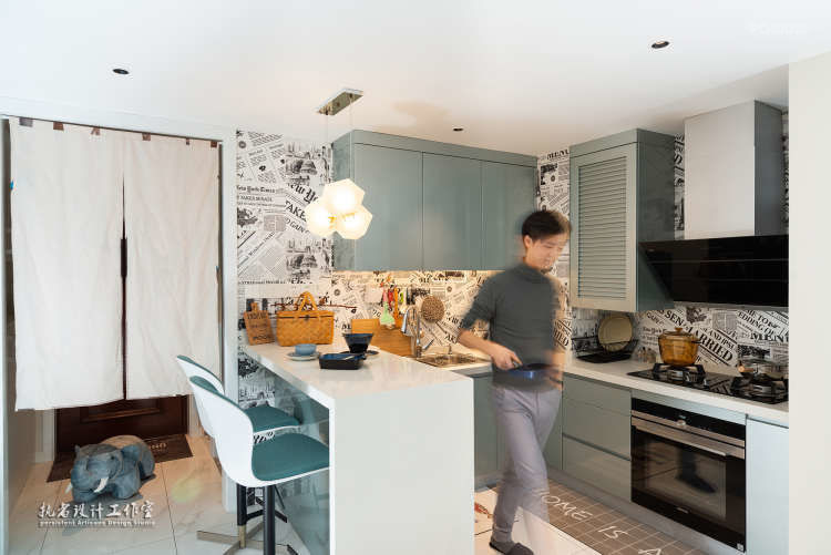 Homeisart,再小巧的空间通过简单的布置,也能散发出文艺的气息。厨房里没有大件的家电,银绿色和白色的搭配让厨房看起来干净整洁又有趣味。屋主跟我说她想在厨房放一个烤箱,所以我们在设计地柜时就为烤箱留下了一个位置,让烤箱可以嵌入进去。厨房里设计了一个早餐台,让业主的早餐可以在厨房解决,即做即食。由于厨房的墙壁容易脏并且不容易收拾,所以我和业主商量后,在墙砖的选择上运用了报纸砖的设计手法,这样厨房不但看起来有了复古的风格,也让整个空间富有艺术的层次感。门厅的隔断采用布帘的形式,即遮挡隐私也不失美感。