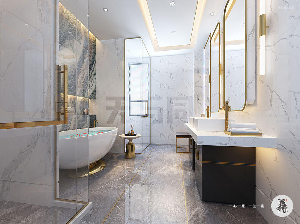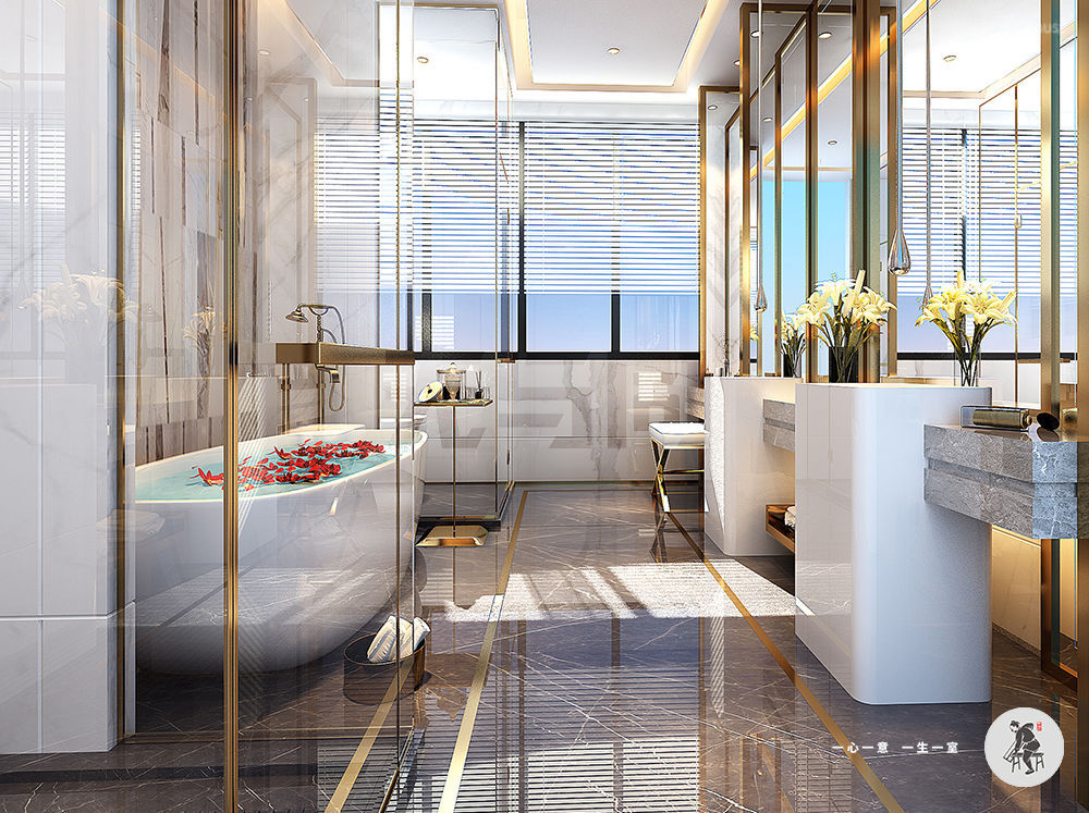 大理石瓷砖铺满整个主卫空间,淋浴间干湿分离整体干净整洁,加上金属线条,增添了卫生间的时尚大气精致感。独立式的浴缸尊享优质生活,浪漫玫瑰浴享受美好时光。