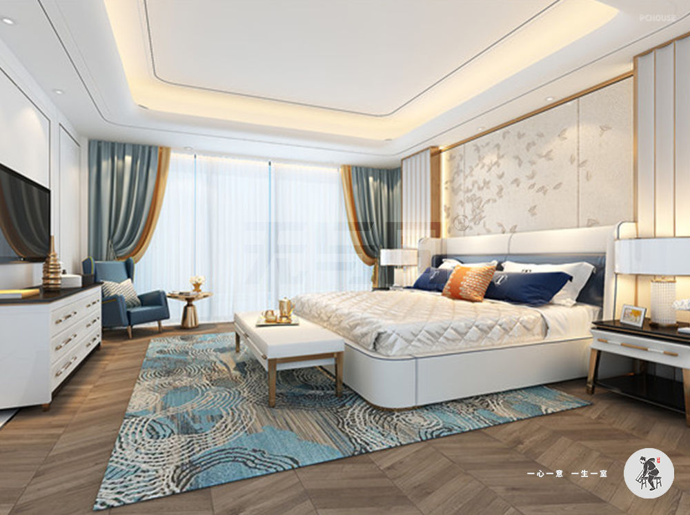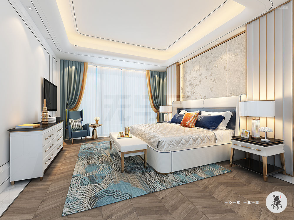 二楼卧室设计灵感源于大自然的琥珀,把世间所有的珍宝变成一种美的存在。空间是精心定制的私人浪漫,在材质与色彩上,透出设计师对细节的专注,以高贵细腻的软包与金属元素来增加时尚感,让整个空间宁静舒适更具魅力。