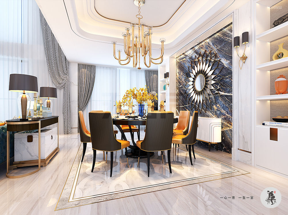浪漫舒适的餐厅空间环境,天然纹理的大理石拼花设计与时尚的水晶吊灯完美结合,“爱马仕橙”是极致的时尚轻奢代表色,适当的金色点缀是客餐厅空间的点睛之笔。如流光般璀璨无比,让水晶散发出迷人的魅力。