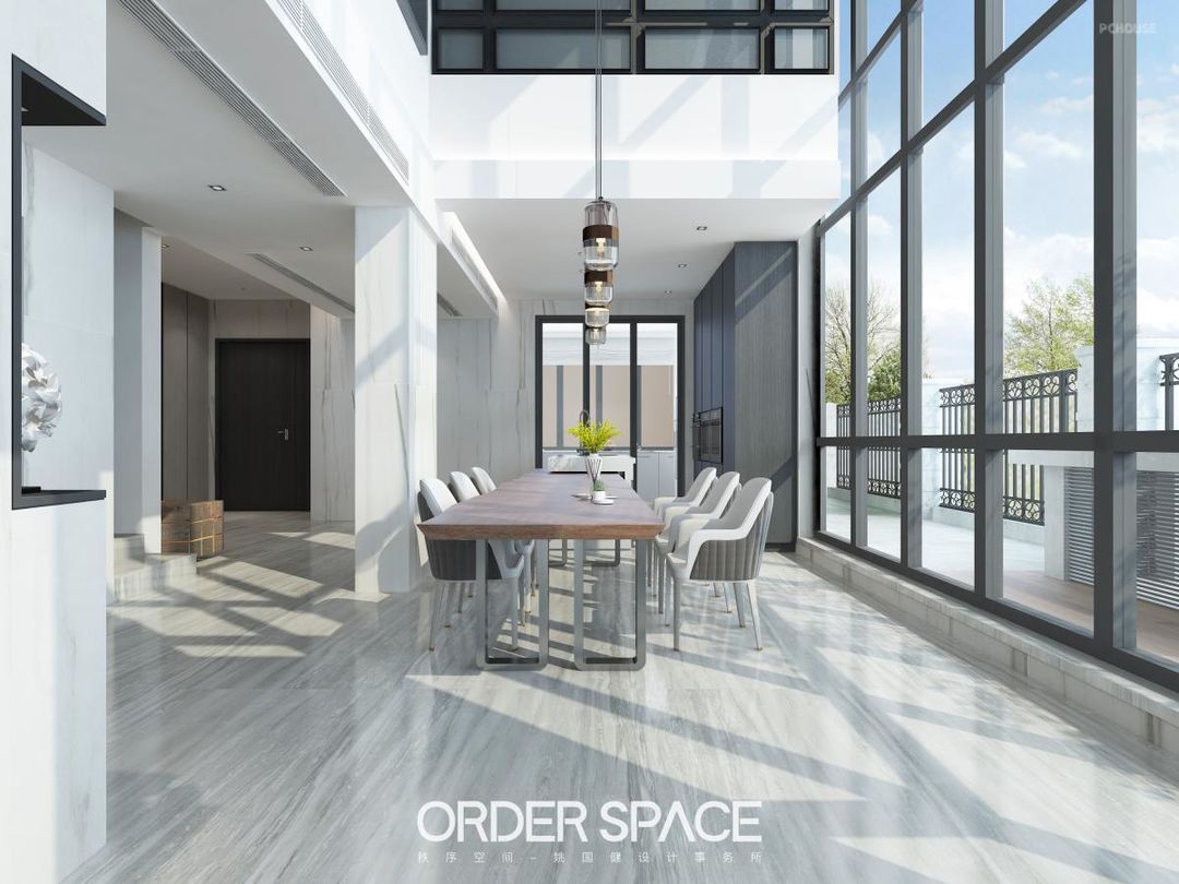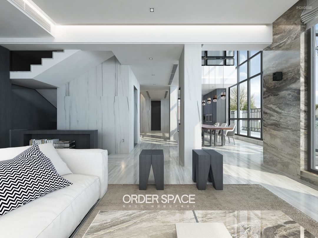 一层设置为公共空间区,三面被阳光和院子包围起来,室内外光影交错,日月流转四季变幻。室内拥有大片的全景落地的玻璃窗户,尽一切可能地“敞开胸怀”和室外一起拥抱。除了大面积全景落地窗的使用让空间感觉通透外,还在墙身选择了白色亚光的大理石,连接过渡了天花木饰面和地面的珍珠灰,营造一个自然,睿智,又不失活力的轻奢空间,轻松自我,光影共舞。