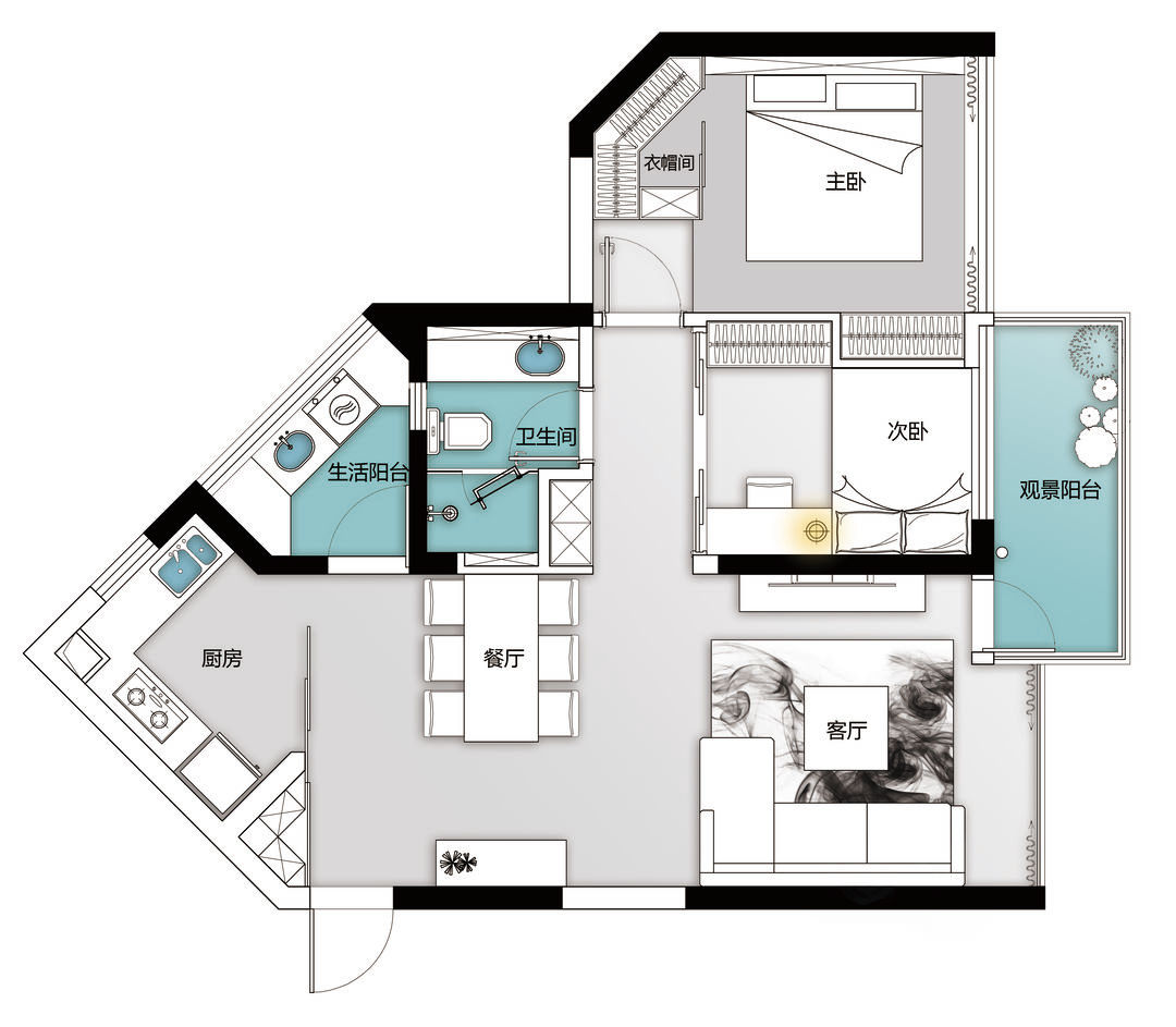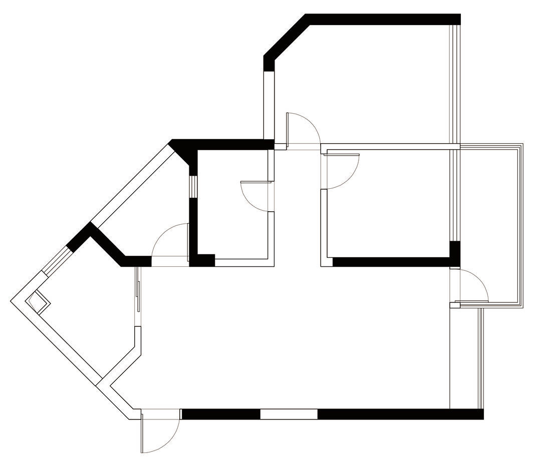 室内植物养起来相当操心,且体积太小,于是我把这个色彩的重任赋予了另一个为之沉迷的题材:敦煌壁画。东方审美都是相通的,没有搭不好的道理。客餐厅的平面布局中,厨房与餐厅之间用三扇的移门,这样做将不规则的区域全部遮挡起来,边角区域形成了很好的储藏功能,三扇大门的设计也让整个客厅显得大气许多,在客厅内看厨房的视觉延伸。三扇滑门,左边一扇是鞋柜,储存量很大,右边两扇是厨房,把鞋柜区域的异形遮挡起来;次卧用了四扇移门,当四扇移门打开时,室内光线变得通透起来;主卧设计衣帽间使卧室变得规整起来,与次卧之间用S型砌墙将两个衣柜隔离,使两个卧室面积利用最大化。