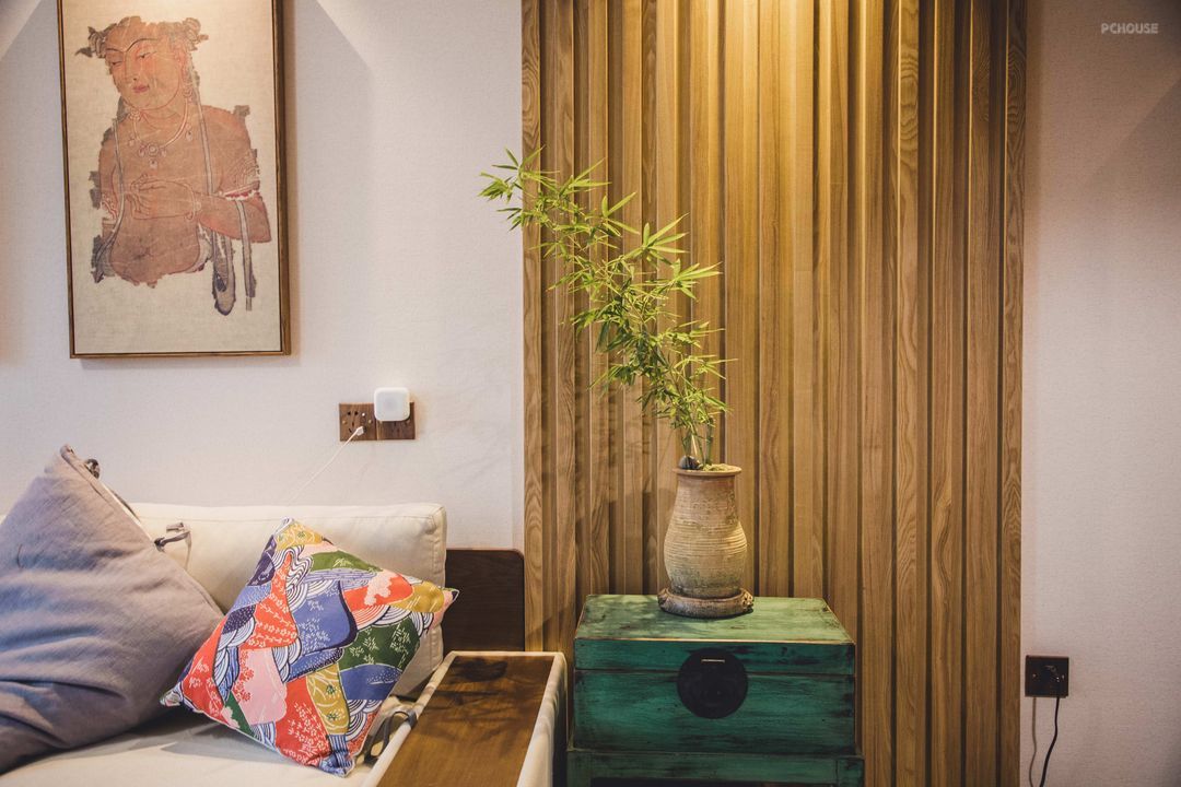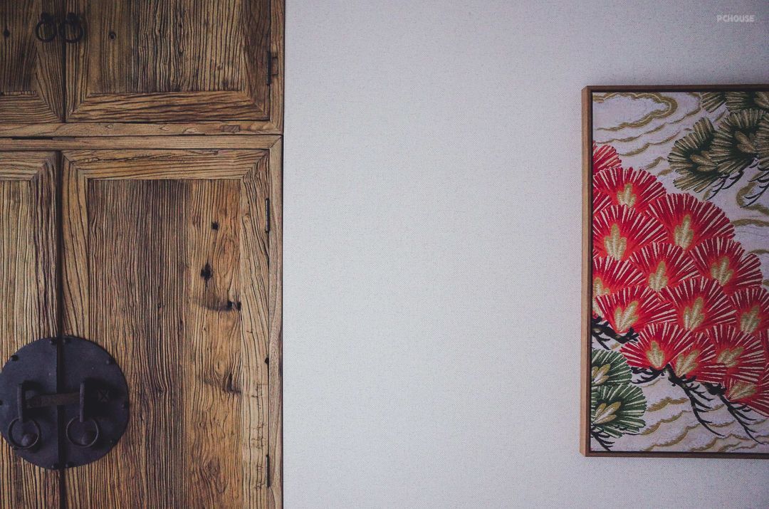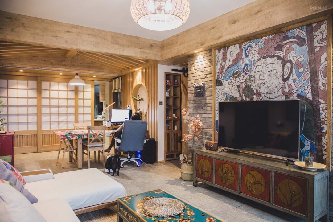 电视墙这副壁纸是客户自己挑选的,壁画经历岁月散发出不可思议的美感,它拥有深厚的历史文化底蕴,使日式复古特色更加浓郁,人们进入这个空间的第一时刻,感受到浓厚的东方情愫。