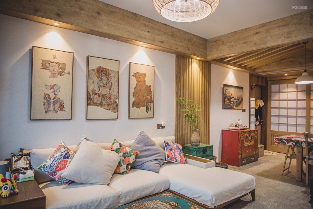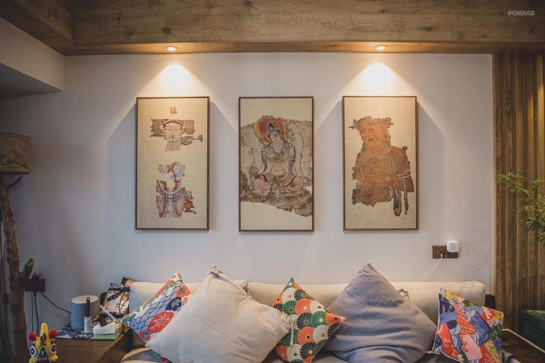 客厅整体色彩淡雅,以白色和原木色调为主,加以彩色作为点缀,挂画选用“敦煌壁画”元素,为观者点亮惊喜,用纯净却饱含深意的艺术品,让来宾意犹未尽,柔和的灯光映衬,使得整个家居舒适而温馨。
