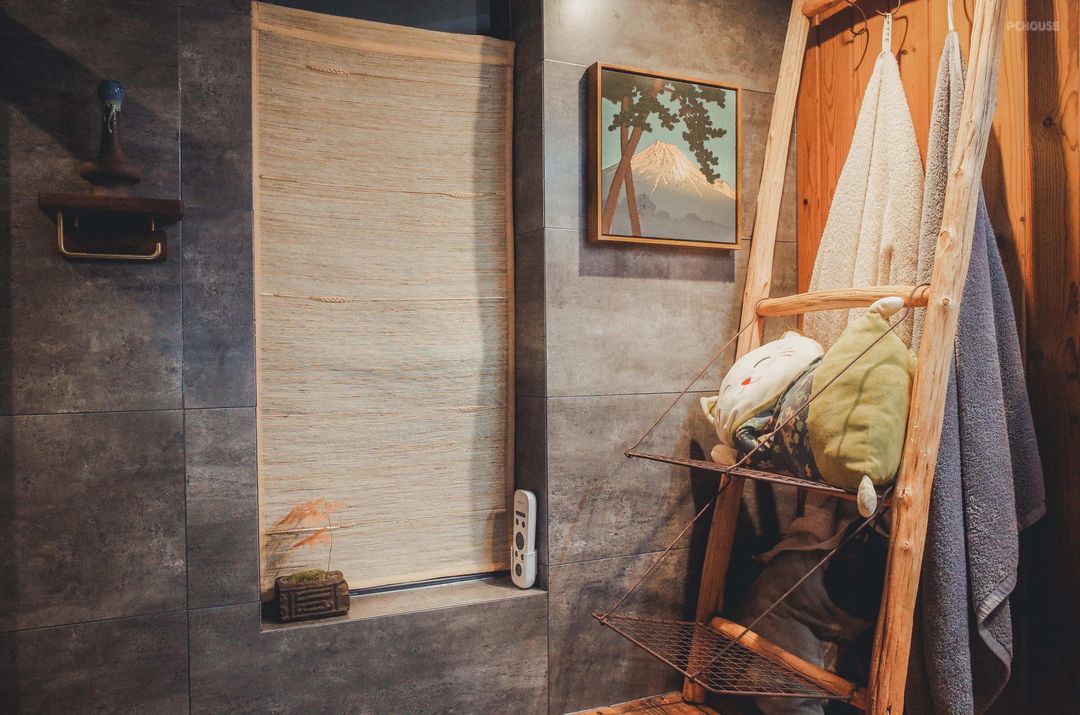 卫生间洗手台梯子搁架,自然的材质与木材背景搭配得当,日式注重收纳功能,简洁自然的陈设将功能实用性体现的恰到好处。