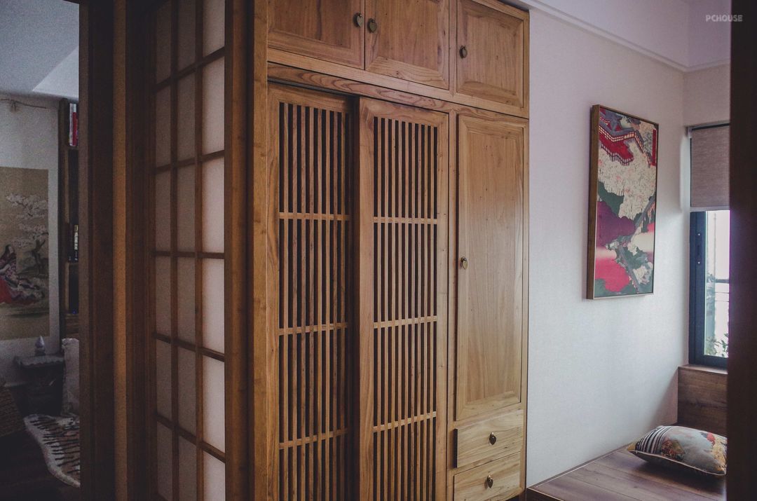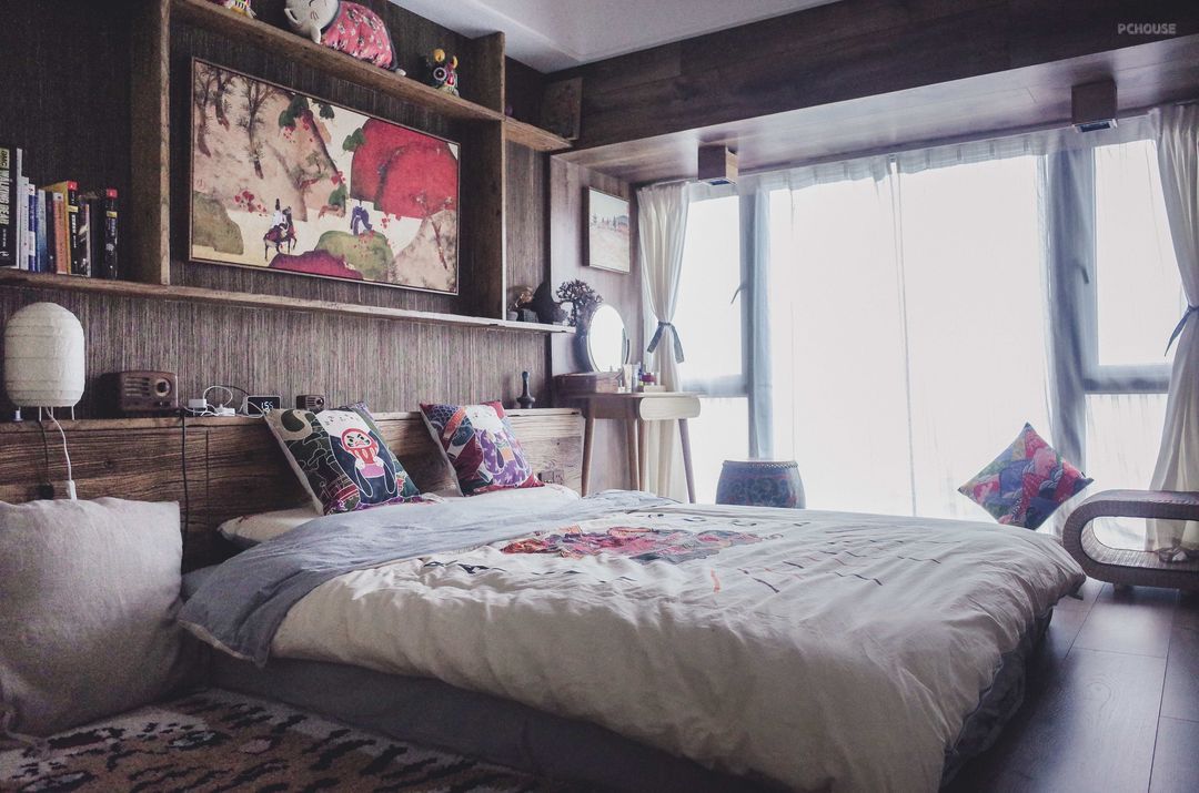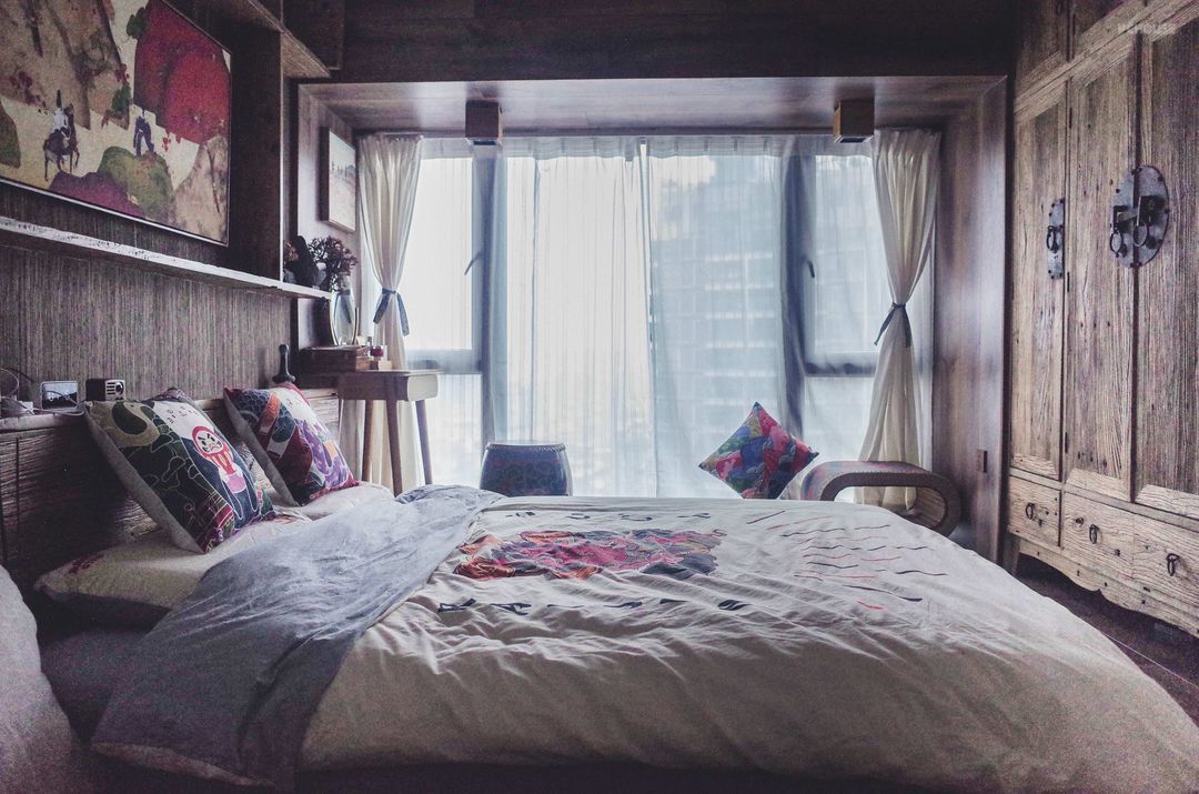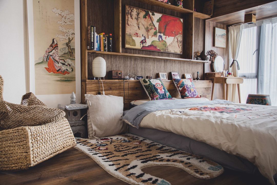 卧室传递出摆脱尘世的束缚,获得散心避世的栖居心境,房间充满艺术的影子,艺术的创作因子来源于传统日式复古文化,而日式文化中的精巧与故事性,正是设计师力图在设计中展现出来的另一层构思。