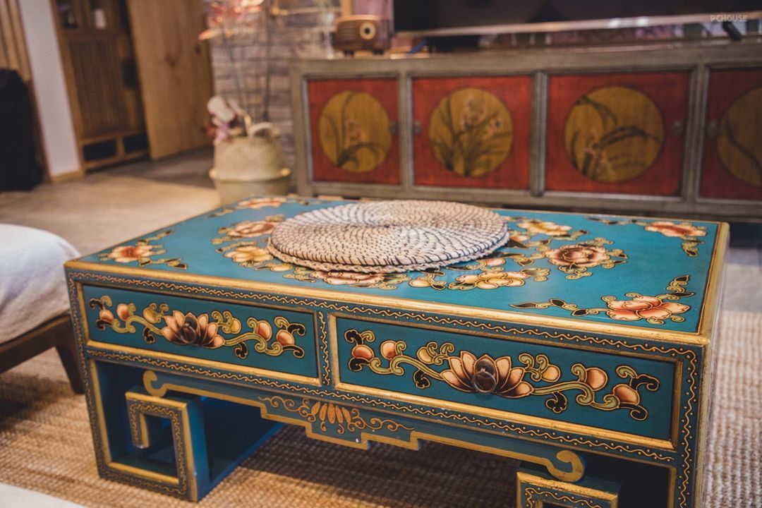 客厅中复古彩漆茶几、复古电视柜,仔细感受材料和工艺的精美细节,家具上的漆膜,使用时的微妙触感,触碰间传达令人心动的感官体验,正是这些超乎寻常的无形奢华,传达了一种文化,一种生活的艺术。