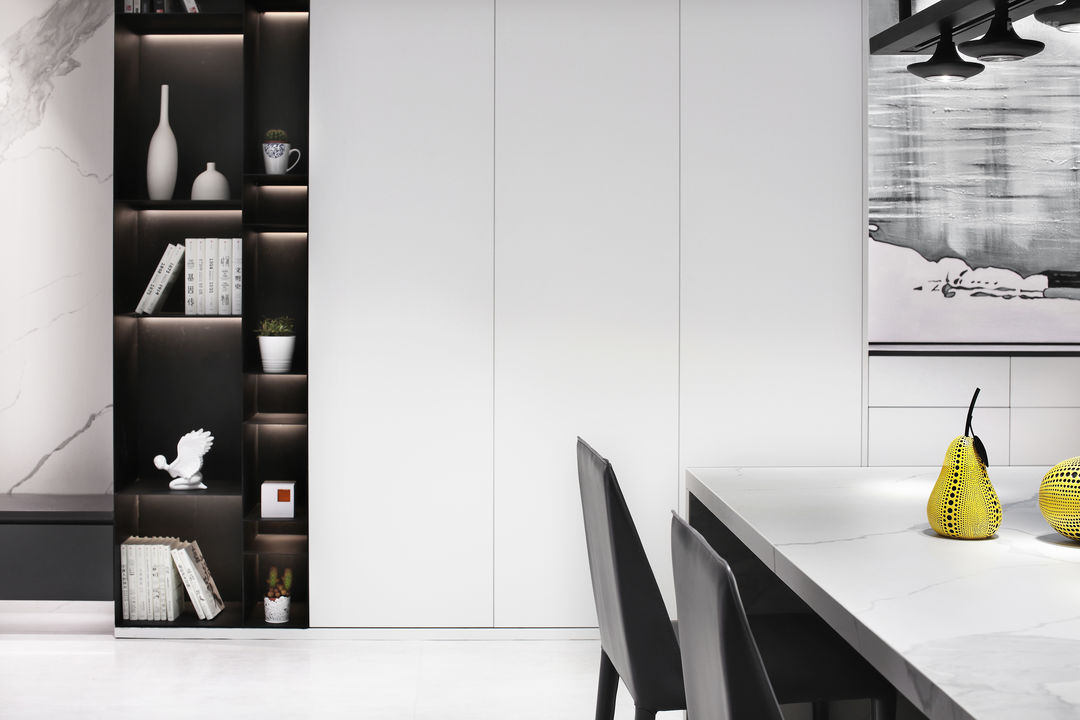 客厅的电视背景墙设计选用了岩板材质,搭配上黑钢板与岩板的材质质感相撞,使空间显得更有层次感。软装也没有过多的选择,在保证使用功能完善的同时给空间留白,没有乏味的多余装饰,在恰到好处中诠释质感。