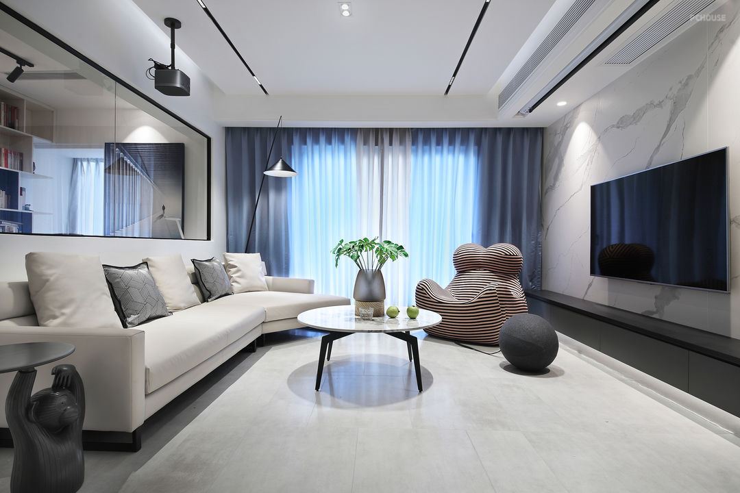 我们在天花设计时尽可能的让空间高上去,包括电视上方的空调机位我们也放了个投影仪的功能进来,业主二人在快节奏的工作休闲之余,可以放音乐看电影。磁吸灯的运用在空间线条的运用也为我们的现代风格加分不少。