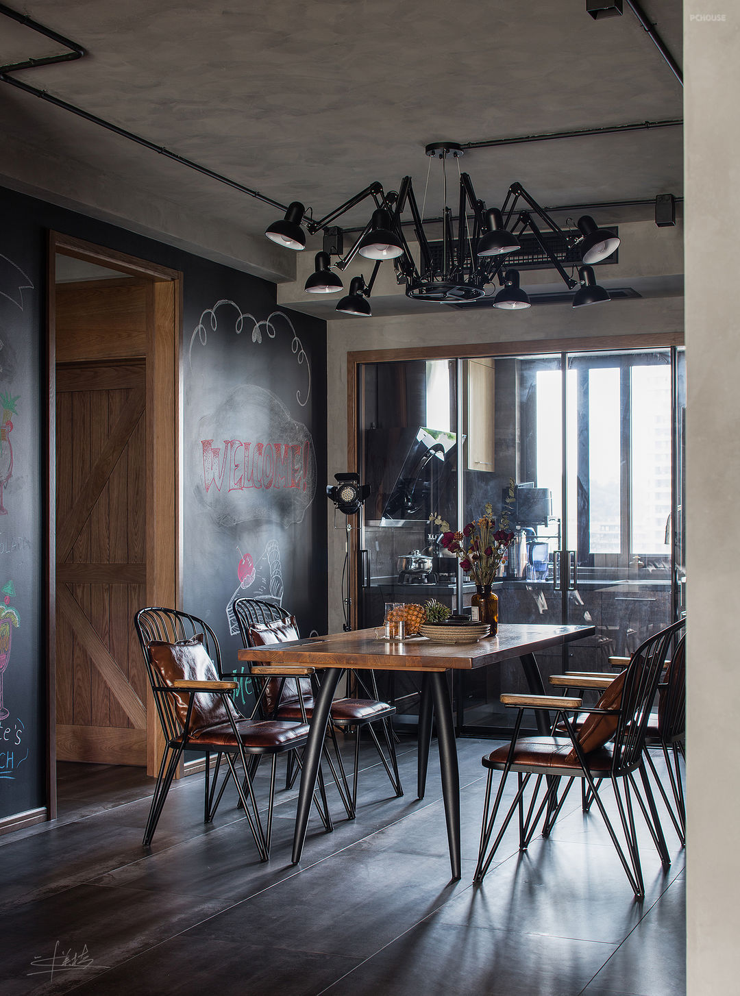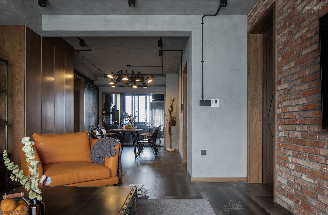 打通原始客厅与生活阳台,把生活阳台的落地窗融入到客厅把餐厅融为一体,改造后的客餐厅拥有40㎡的通透空间。使得进入室内空间的采光和通风到达最佳效果,增加空间的 连贯性与延续性。室内以灰阶水泥为基调,并将粗犷红砖做为客厅的主题墙,裸露的管线,再使用收纳柜门上做了一点做旧复古粗旷原野自然的感觉与黑皮椅垫,打造充满浓郁工业调性的沙发水泥灰的空间。植物是一种装饰元素,在水泥灰的框架下更好的发挥其长处,不仅可以为中性的空间带来微妙的色彩,还可以帮助清洁空间,让家居生活更健康。