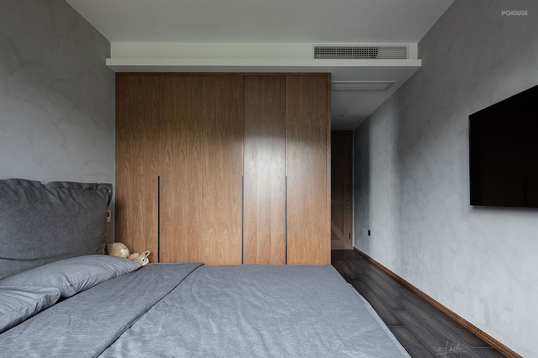 营造出一种轻松自在的视觉享受因此次卧色调略浅一些,素色的比例更高。降低家具的存在感,弥补宁静简约。