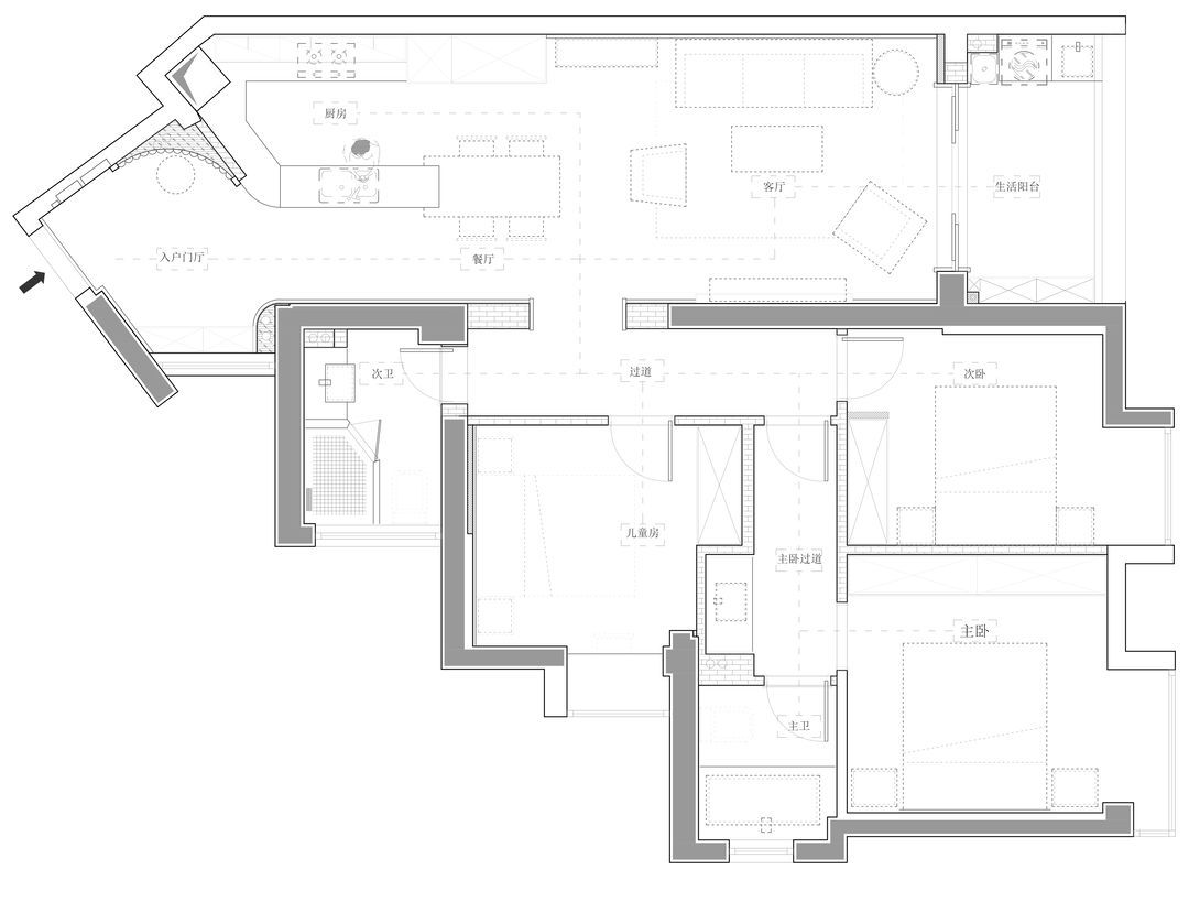 常住人口是一家三口,女主人大部分时间独自在家,同时要辅导孩子的学习和照顾男主人的生活起居,所以需要尽可能多的储物空间,并且为了增强家人的情感互动性,我们打开了厨房,让家人之间的交流更加通畅。