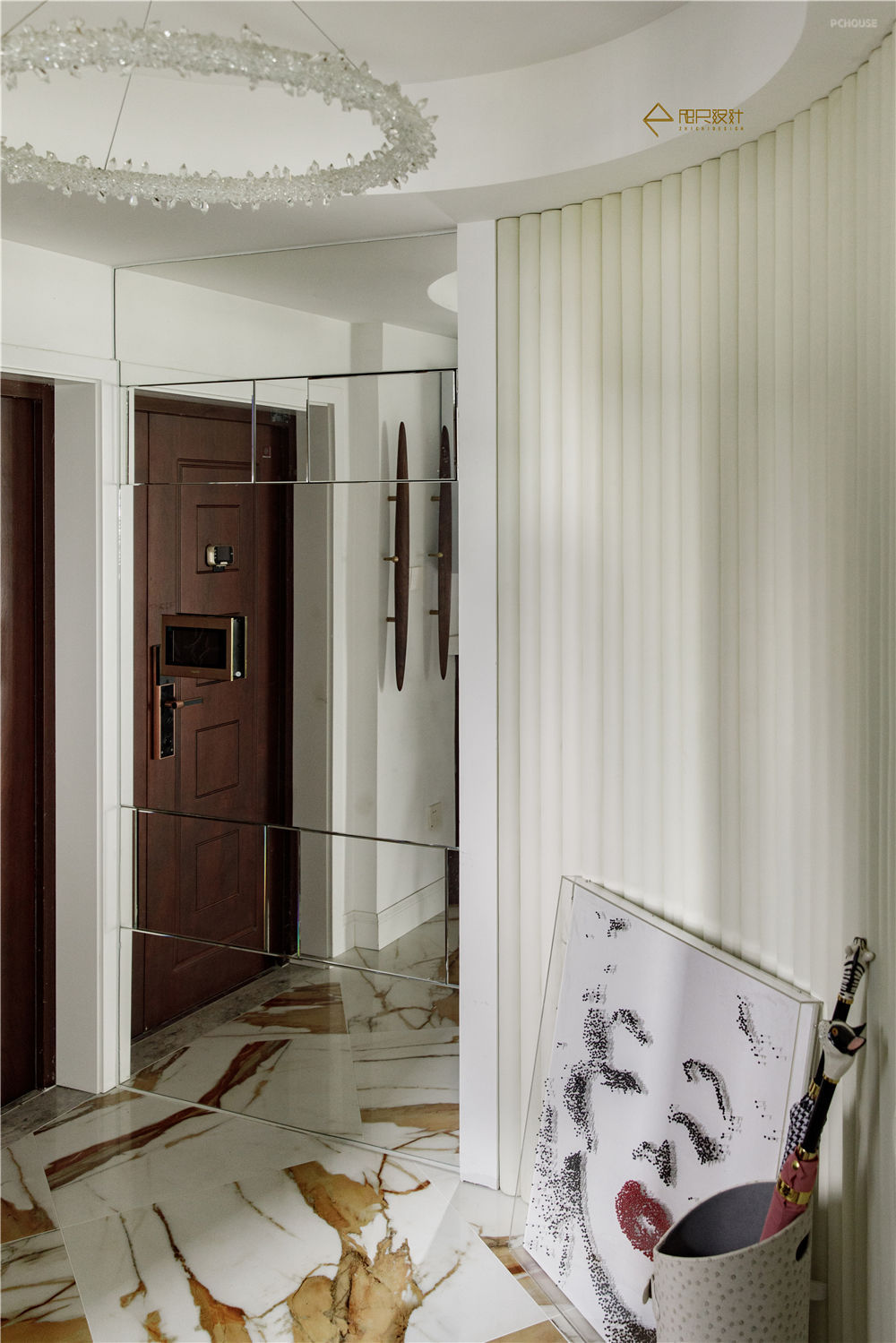 玄关区域拆除原本在室内形成阴角的墙体,巧妙运用曲线实现了玄关向室内的过度,将客厅良好的采光引入到玄关,同时延申了入户时的视线,拉宽了空间感,