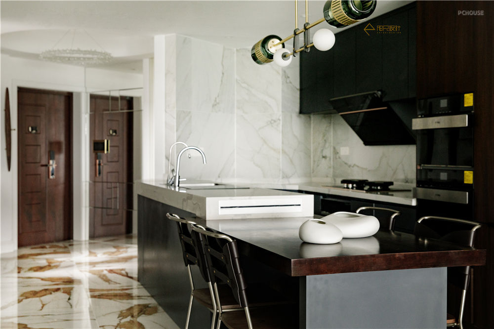 改变了原始户型的一个房中房形式的厨房,将厨房、餐厅、客厅融合为一体,打造成开放式厨餐一体,改善原有的采光差通风差的问题