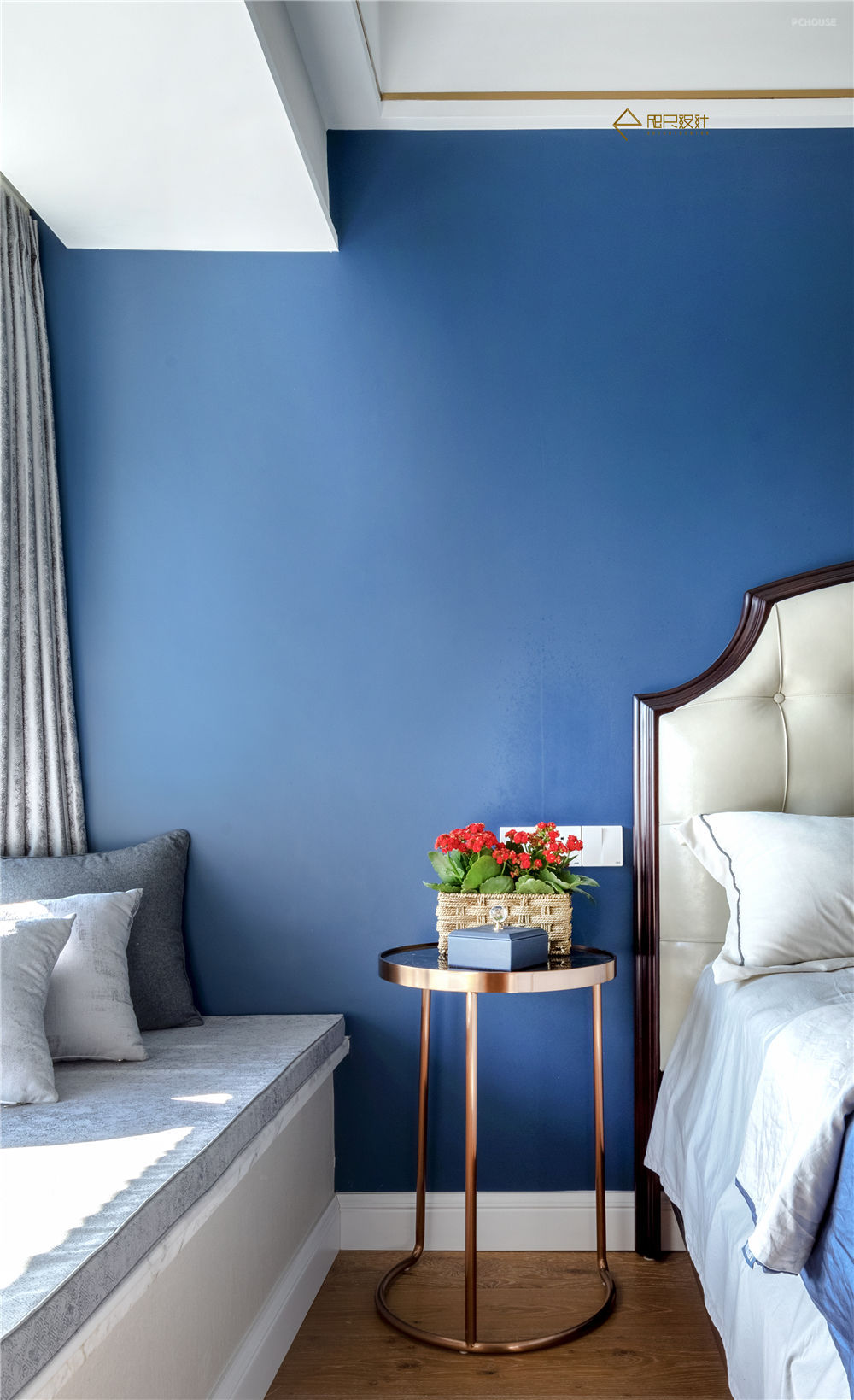 次卧采用的是非常干净清爽的蓝色,有利于缓解人的疲劳,放上一束鲜艳的红色花朵,避免空间的颜色太过单调。