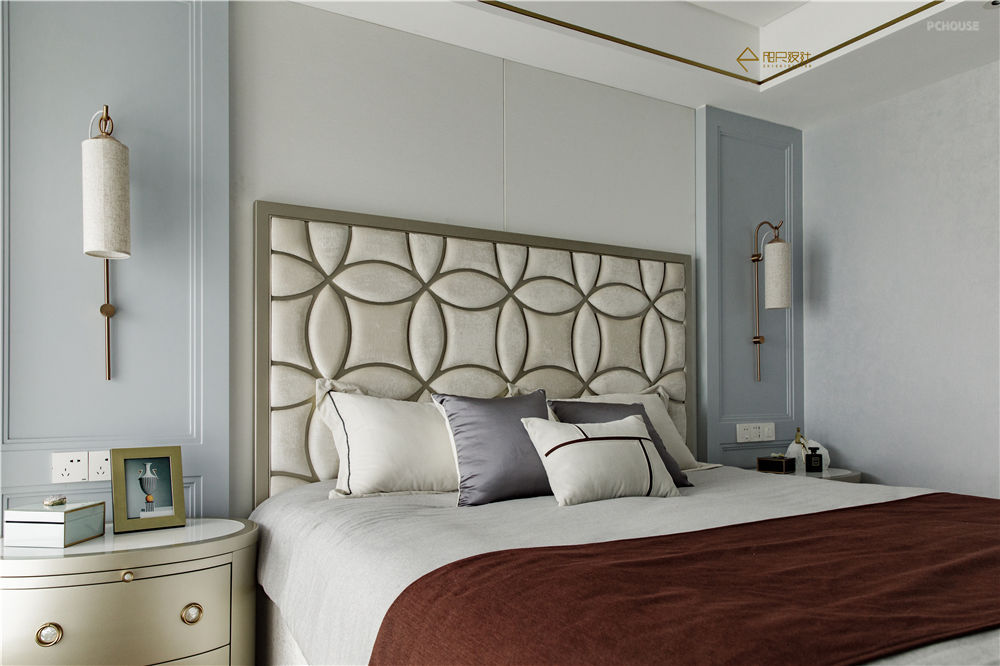 主卧的配色选用低饱和度的湖泊蓝为整个空间做底,搭配米咖的床头装饰以及红棕色的床品,为惬意幽静的空间加上一抹律动的色彩,到下午的时候,阳光透过来,整个房间显得暖烘烘的,温柔地包裹住着屋里的人们