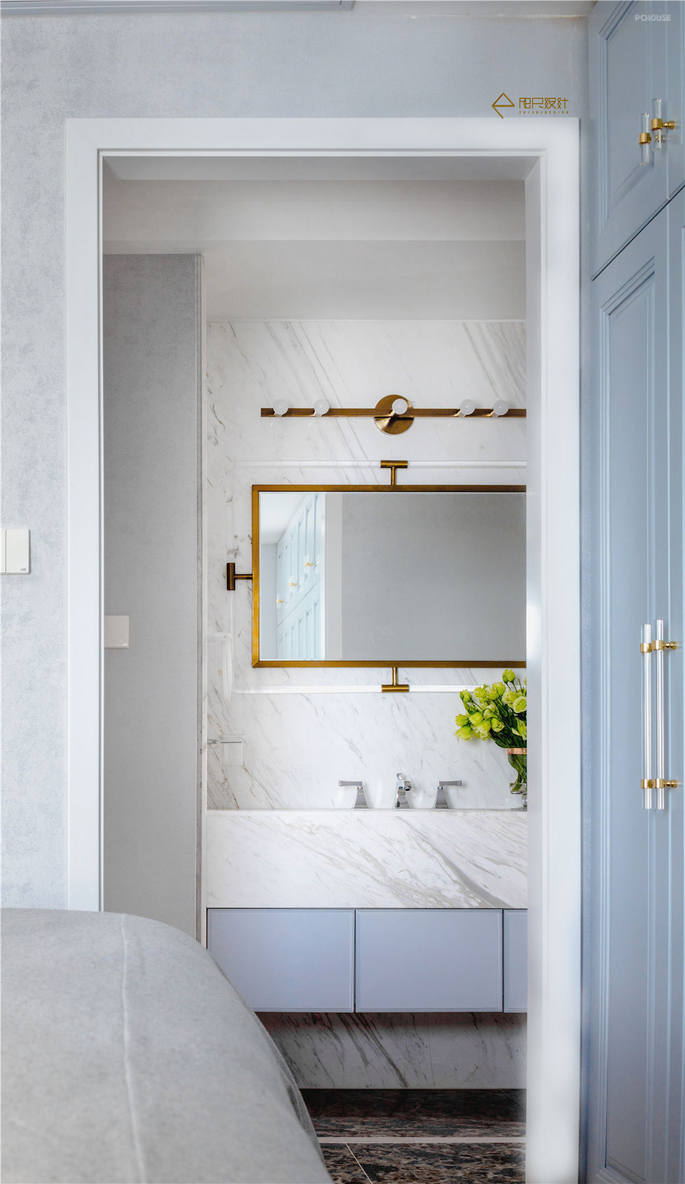 曲面墙用浅色线条软包饰面,搭配精致的石材地面,营造了一份安静又不失美好的空间质感