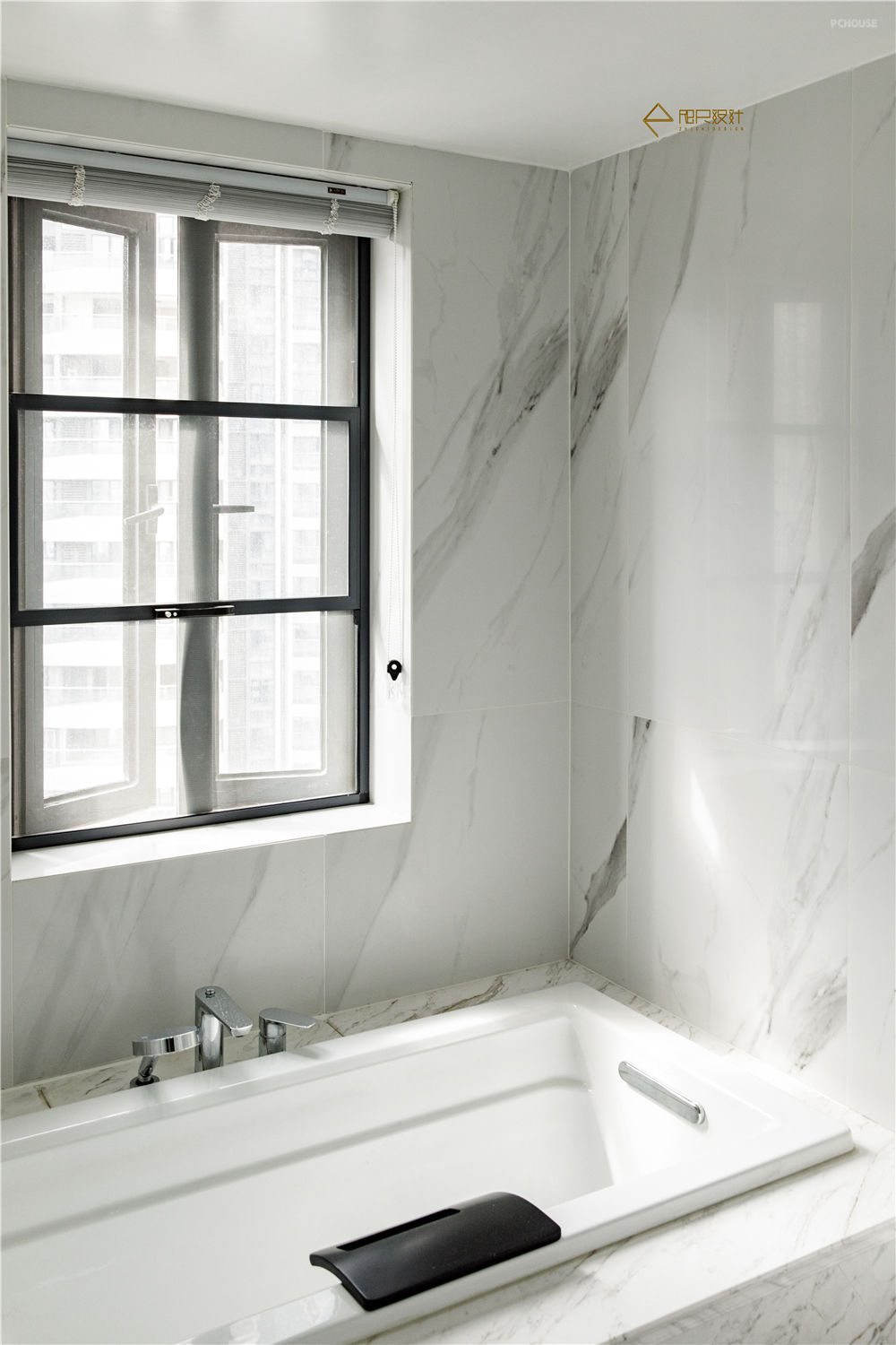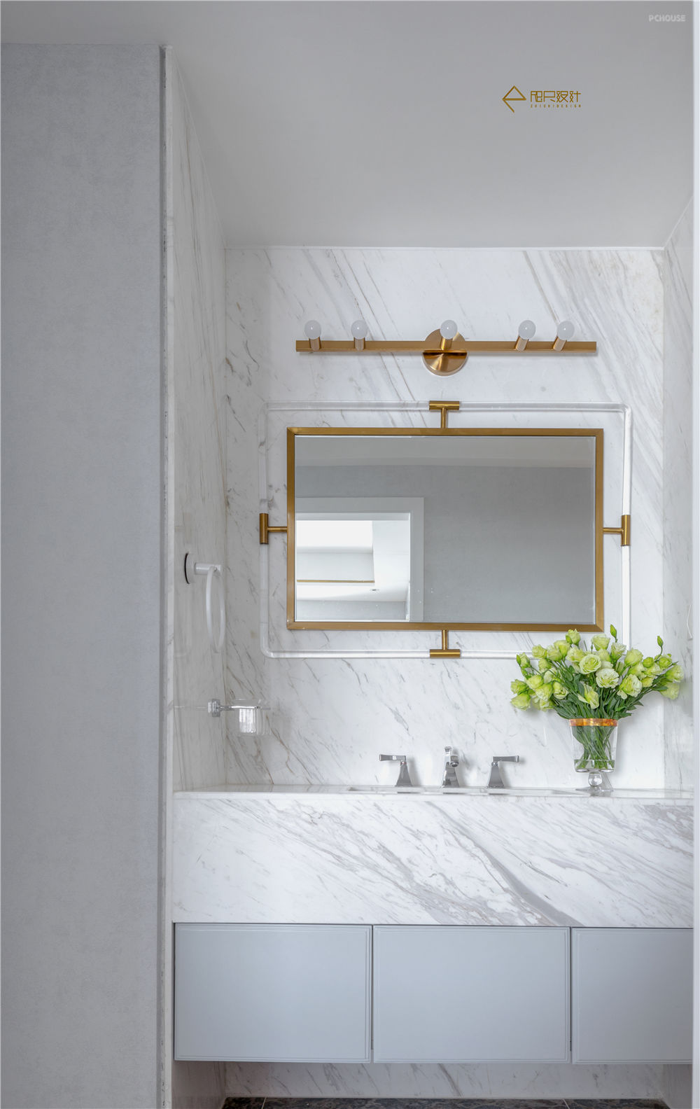卫生间是标准的干湿分离的形式,清浅的大理石台面上点缀着一支绿植,屋主人早晨起床洗漱时,映入眼帘的一摸活力,温馨而美好。