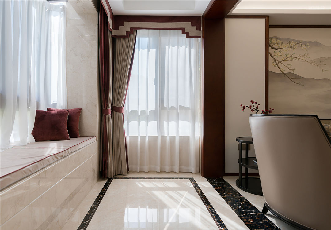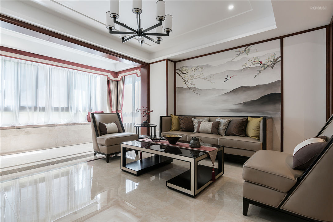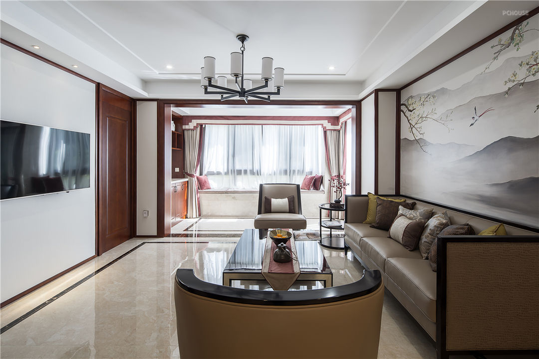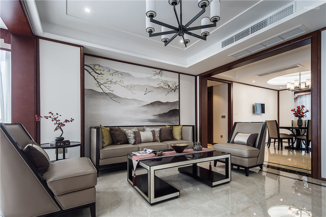 整体设计采用现代新中式的风格,没有一些冗杂的装饰设计,注重于格局规划和功能分配,以胡桃木和艺术漆作为饰面材料,减少大理石的冰冷感,以米色调为基准,用软装及画增加空间的活力,带动出禅意中含蓄的雅致。
