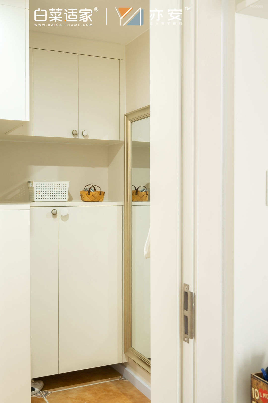 玄关处除了有常规的鞋柜,还设计了一个全身镜,方便了平常出门前的衣着检查,让自己更美美的出街。