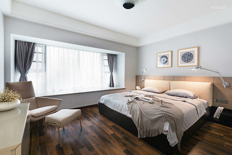 这张图看过去,客厅的硬装部分相当的简单,几乎白墙和深色木地板的搭配,软装的出彩显得尤为重要。