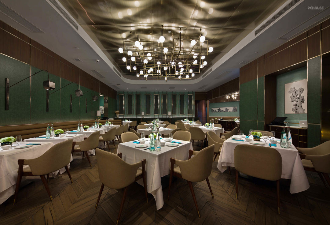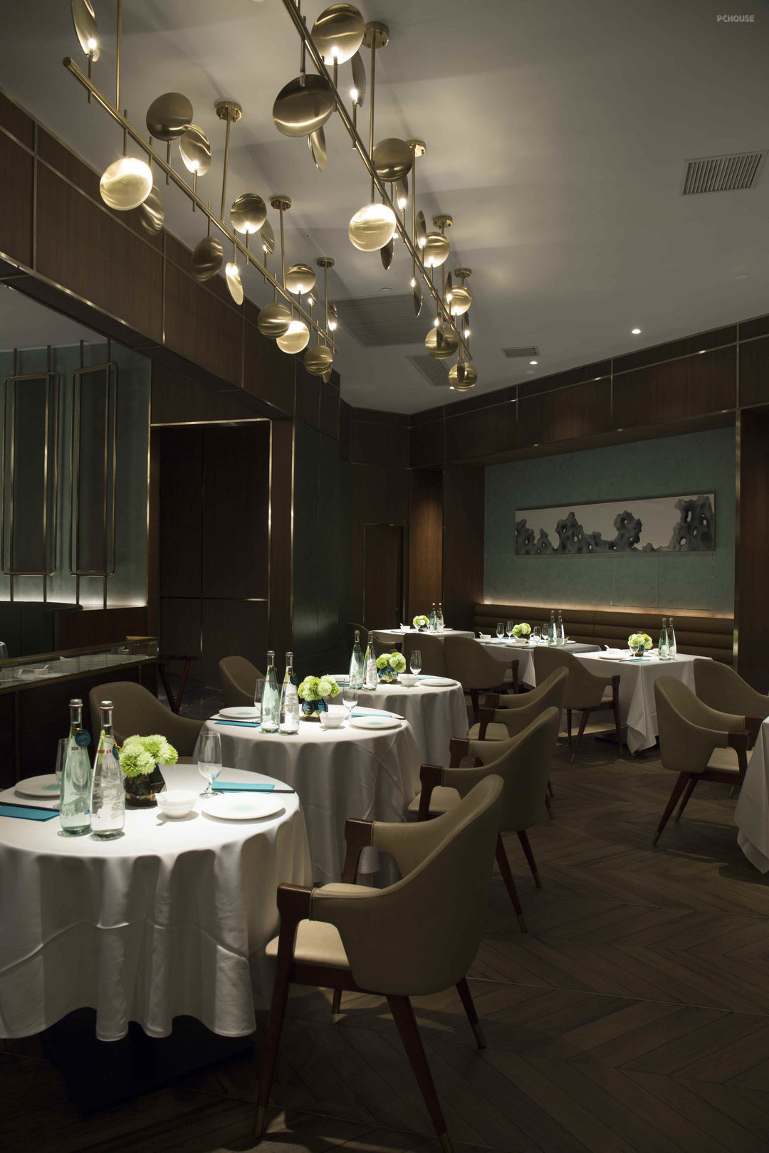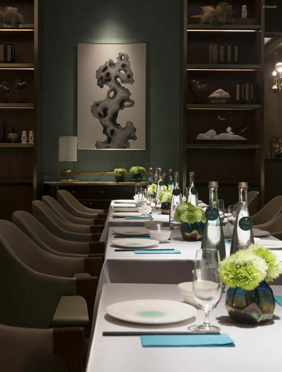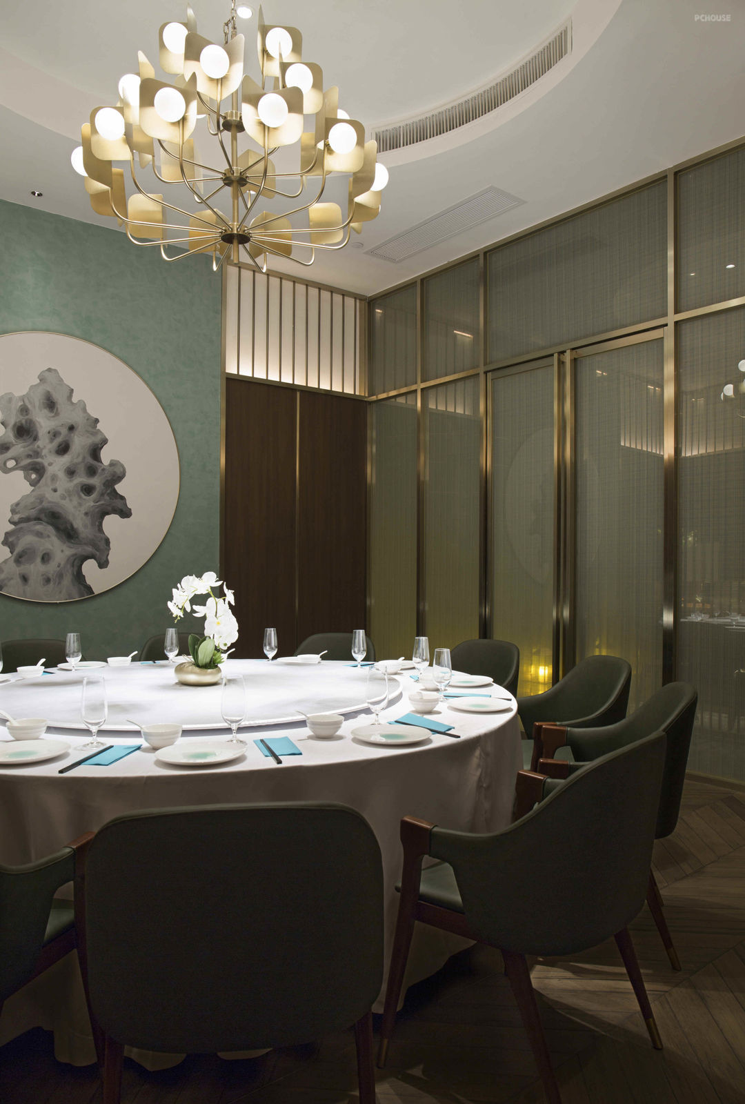 前言: 当今国潮风盛行,设计师以国色石青色为主色调,太湖石作为点缀贯穿整个设计。经典皮质沙发、现代中式灯具、时尚单椅的混搭组合,石青色的色调与照明应用,随处可见的黄铜线条打造别具一格的现代中式风格。不同装饰材料对用餐空间有序的划分与贯穿,入口的吊顶镜面材质与金属隔断拉高了整体空间,创造了强烈视觉效果及空间感;用餐空间墙面的不同材质变化与太湖石挂画赋予整个空间格调雅致;各个区域灯光及造型的应用与辉映彰显空间的灵动性,营造出精致舒适且略带小资感的用餐空间。