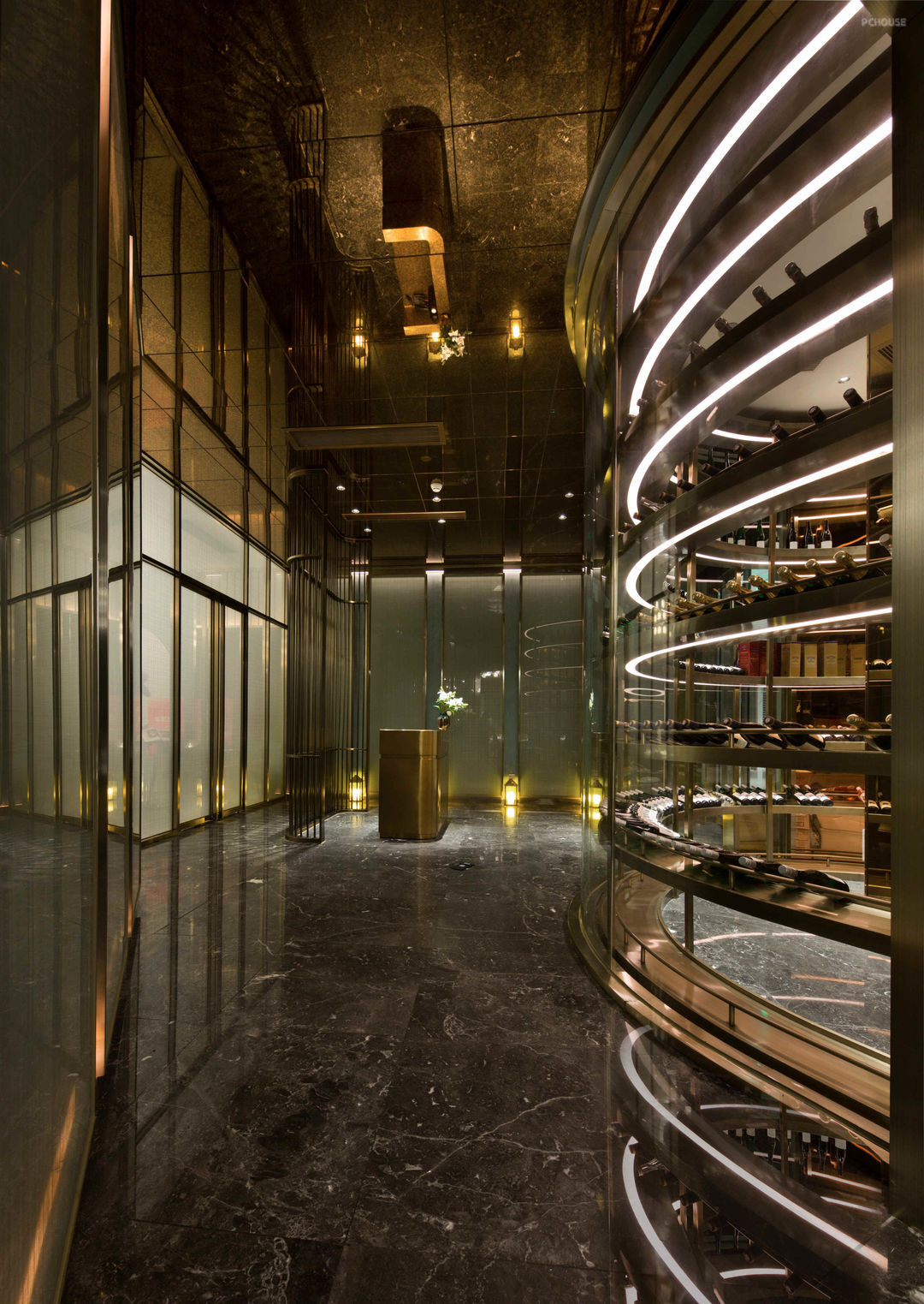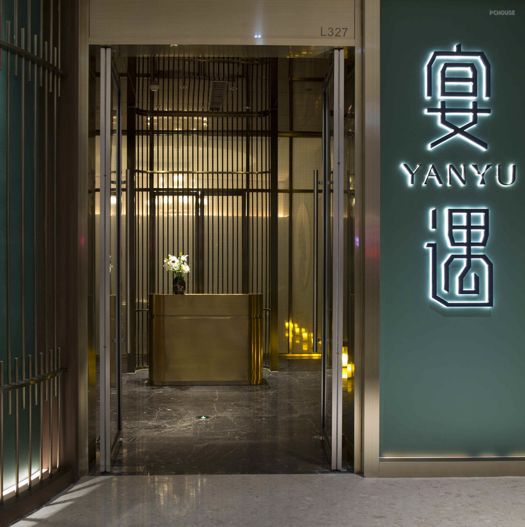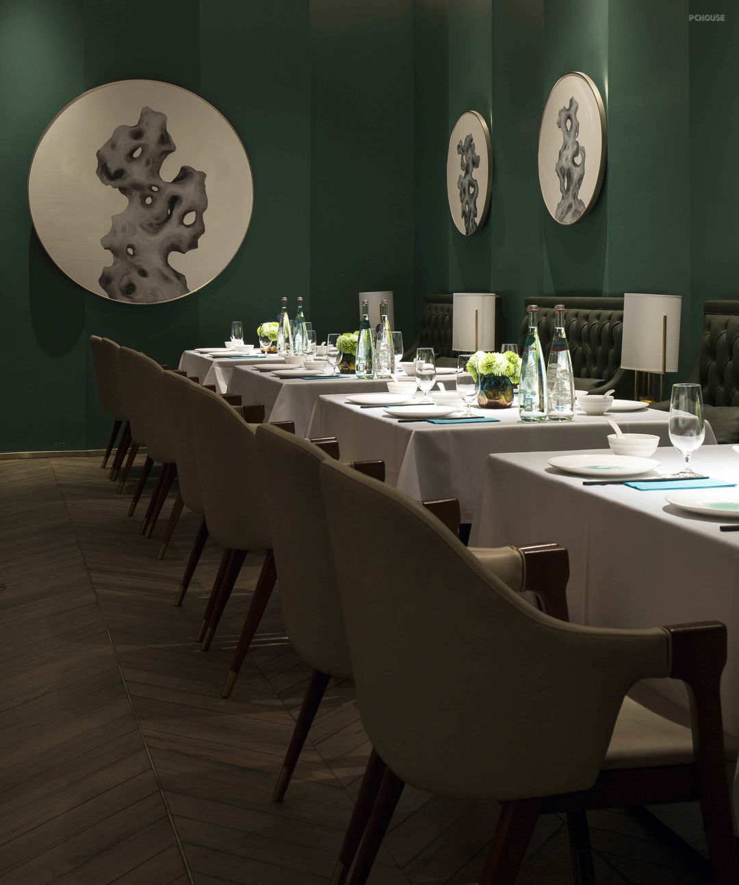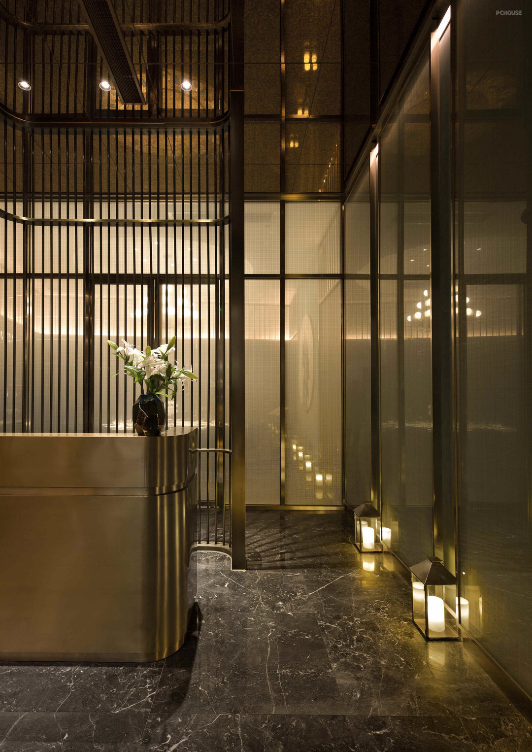 前言: 当今国潮风盛行,设计师以国色石青色为主色调,太湖石作为点缀贯穿整个设计。经典皮质沙发、现代中式灯具、时尚单椅的混搭组合,石青色的色调与照明应用,随处可见的黄铜线条打造别具一格的现代中式风格。不同装饰材料对用餐空间有序的划分与贯穿,入口的吊顶镜面材质与金属隔断拉高了整体空间,创造了强烈视觉效果及空间感;用餐空间墙面的不同材质变化与太湖石挂画赋予整个空间格调雅致;各个区域灯光及造型的应用与辉映彰显空间的灵动性,营造出精致舒适且略带小资感的用餐空间。