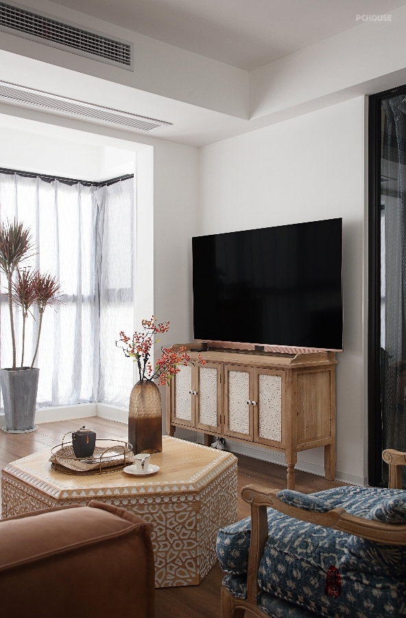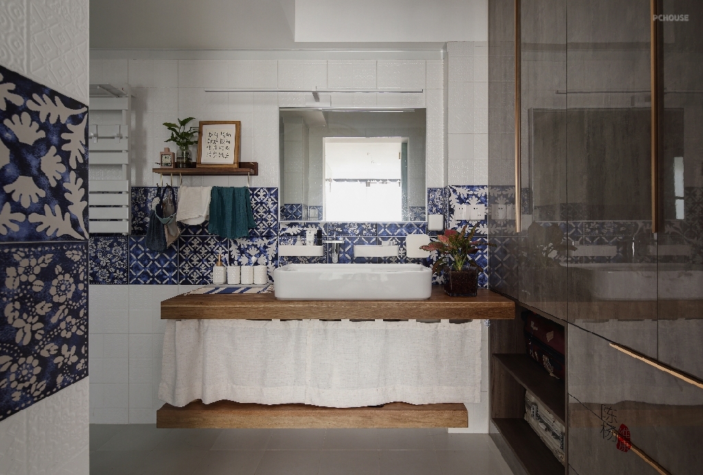 卫生间的花砖腰线拉伸的空间的纵深感,淡蓝色,白色和原木色的搭配让人心旷神怡。波普风的藏族图案花砖比维多利亚的秘密还要神秘,搭配亚麻的纯色布帘,和那些桌面、窗台、洗手盆、地面的原木色交相呼应,看上去群魔乱舞实则不经意间的随心而为。