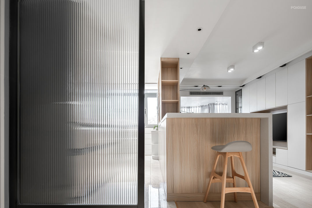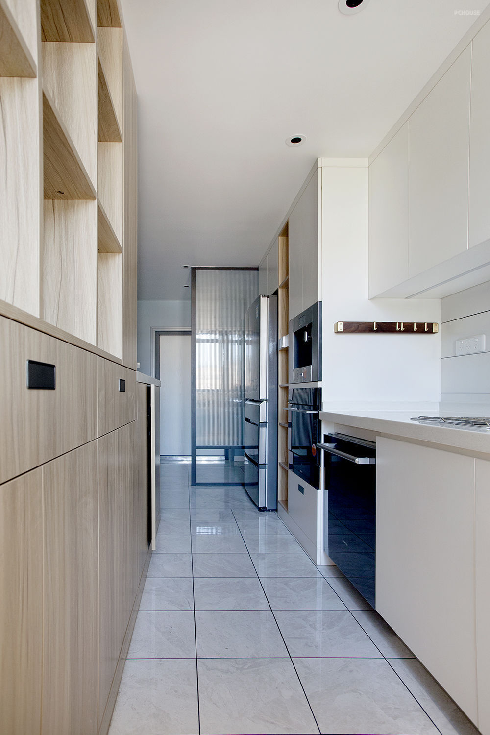 墙面和所有订制材料都严格把控误差,避免过道距离被压缩,加上两旁无把手的橱柜,才得以实现900mm的宽敞距离。厨房唯一的单面采光,可以直接通过对面的长虹玻璃,为玄关解锁不错的自然光线。