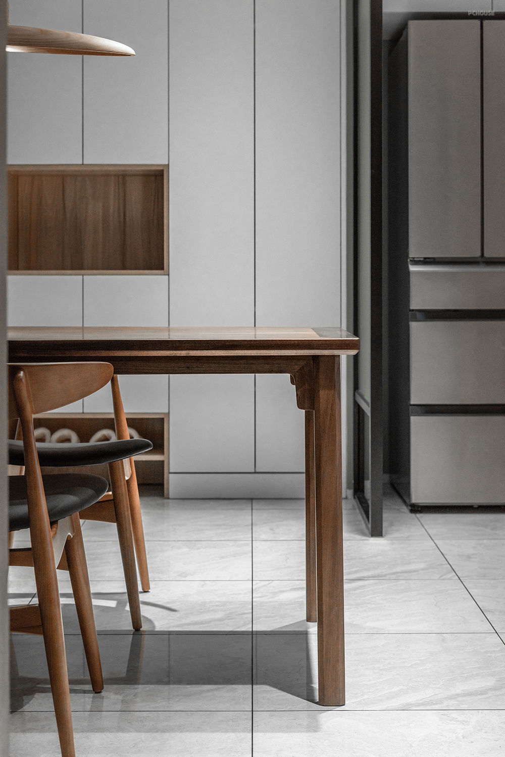 餐椅选自Norhor的经典胡桃款,搭配深胡桃餐桌和的木修远家的花语无声双头餐灯,美貌和实力并存。