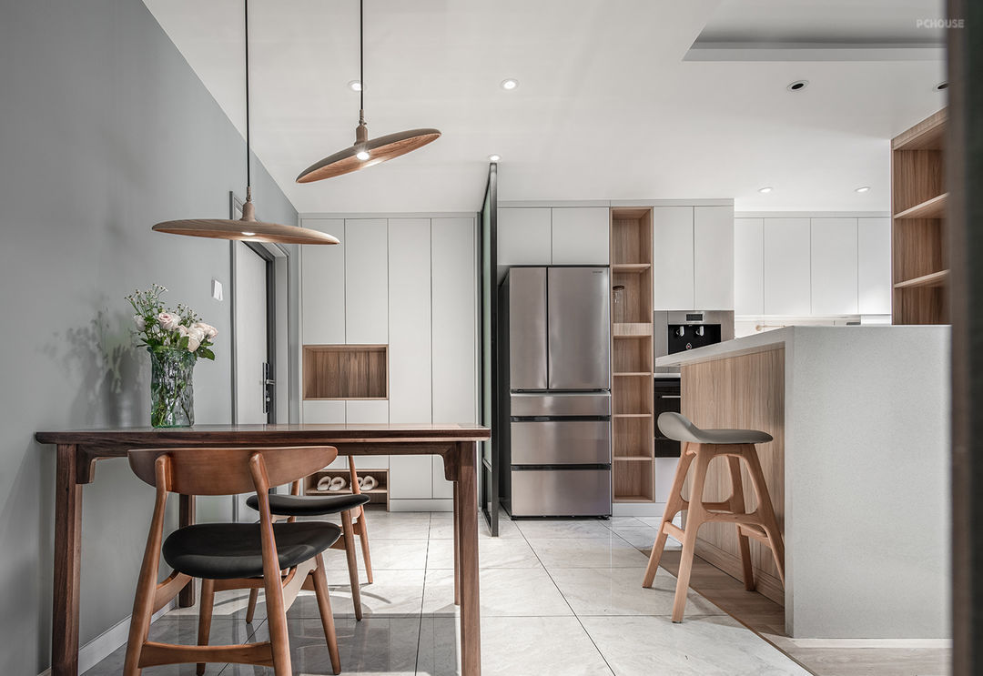 宽敞的空间一边,是两处餐桌+吧台的双就餐区域,开放的格局让这里的光线变得很好,也缓解了厨房传递餐食的步线距离。双餐厅的设置,也让多人就餐,休闲餐点与正餐,在这个场景中自由切换。
