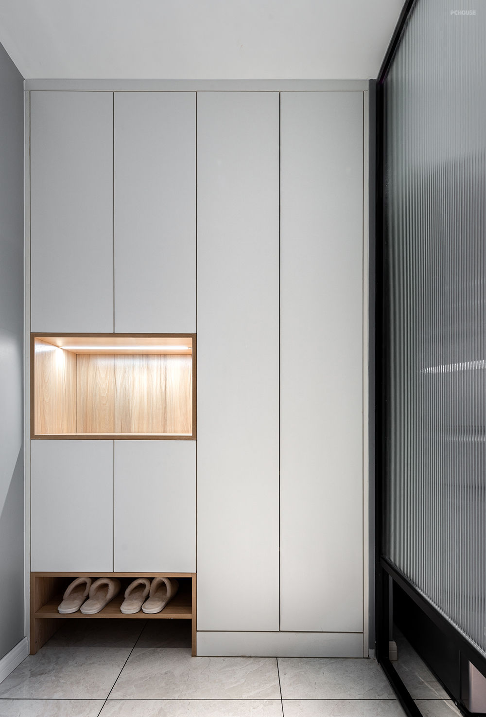 入户柜极大提升空间的利用。内嵌的感应灯带作为过度光源,让深夜回家,进门开灯的一瞬间不再晃眼。