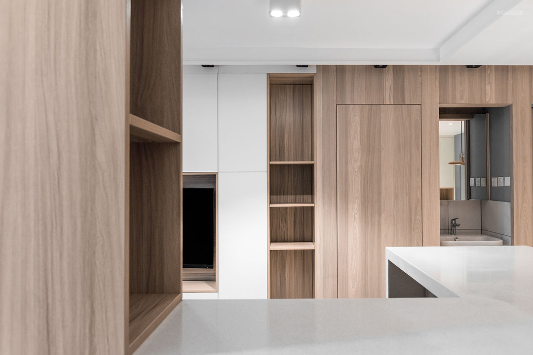 利用橱柜,收纳,动线综合组成设计的吧台,让空间达到更有效的使用。转角吧台上有一段书柜,180°的三向开口,让摆放的形式不单一。