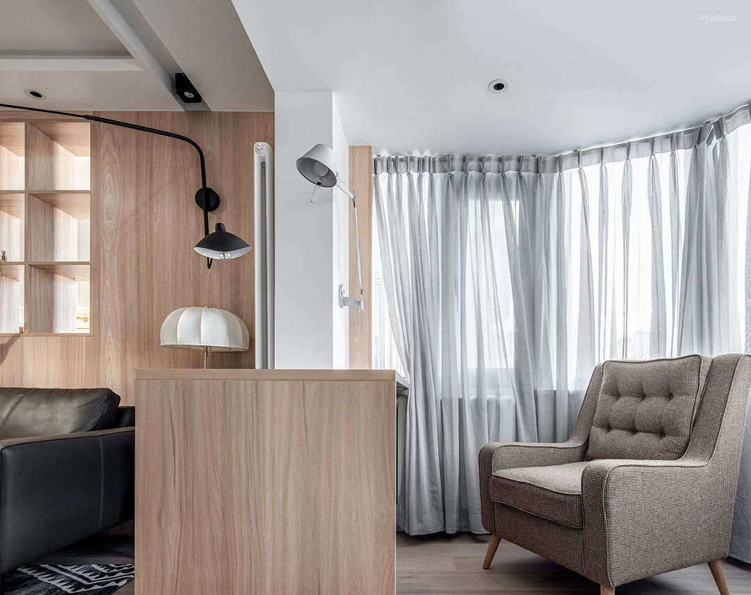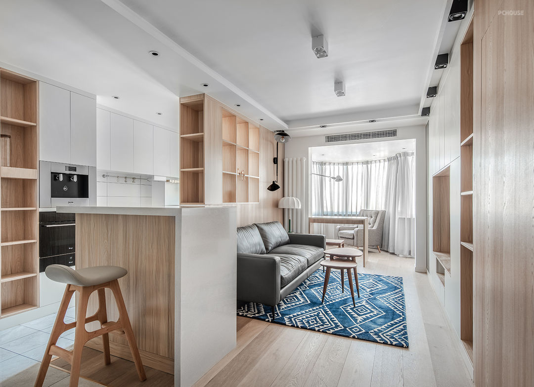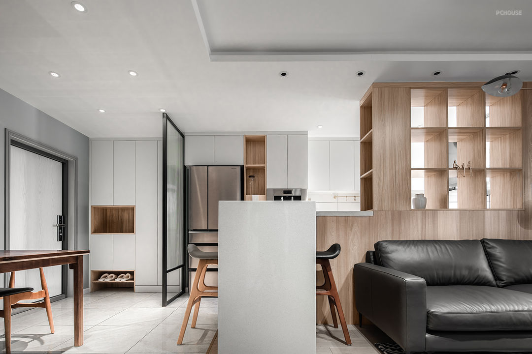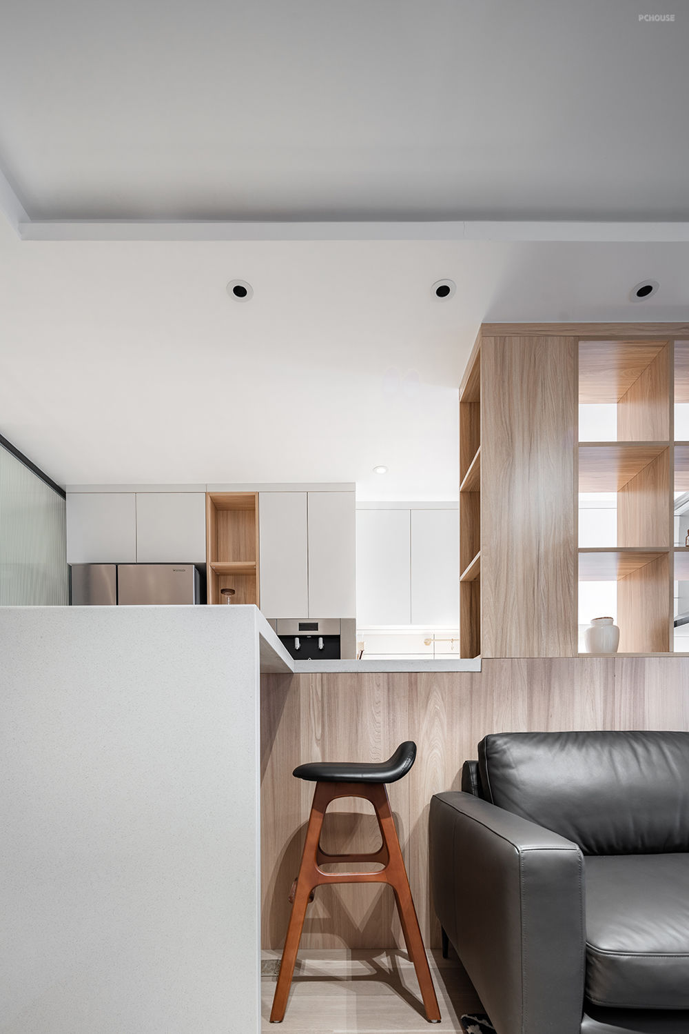 干净的白色石材与柜板做了内嵌,单纯得简单。作为厨房和客厅,客厅与餐厅之间的过度功能,吧台显然有着不错的独特作用。沙发和吧台之间有一段800mm的距离,方便对坐吧椅摆放。
