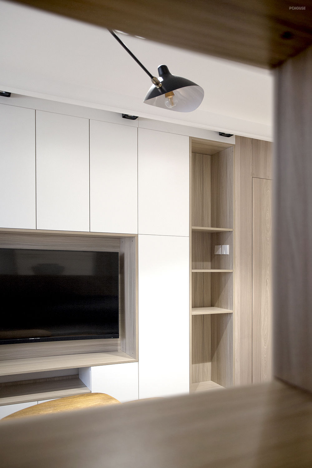 Rebea思考的是尽可能简化自己家中的复杂装饰,所以无论墙顶地,甚至连家具都是以点线面的形式呈现。无主灯的天花走向,让不同形式的射灯布置,有了多种光影变换。开放的客厅,实际与其他公共空间是互通的关系,也通过视觉延展的方式,释放了屋主对空间的存在感受。