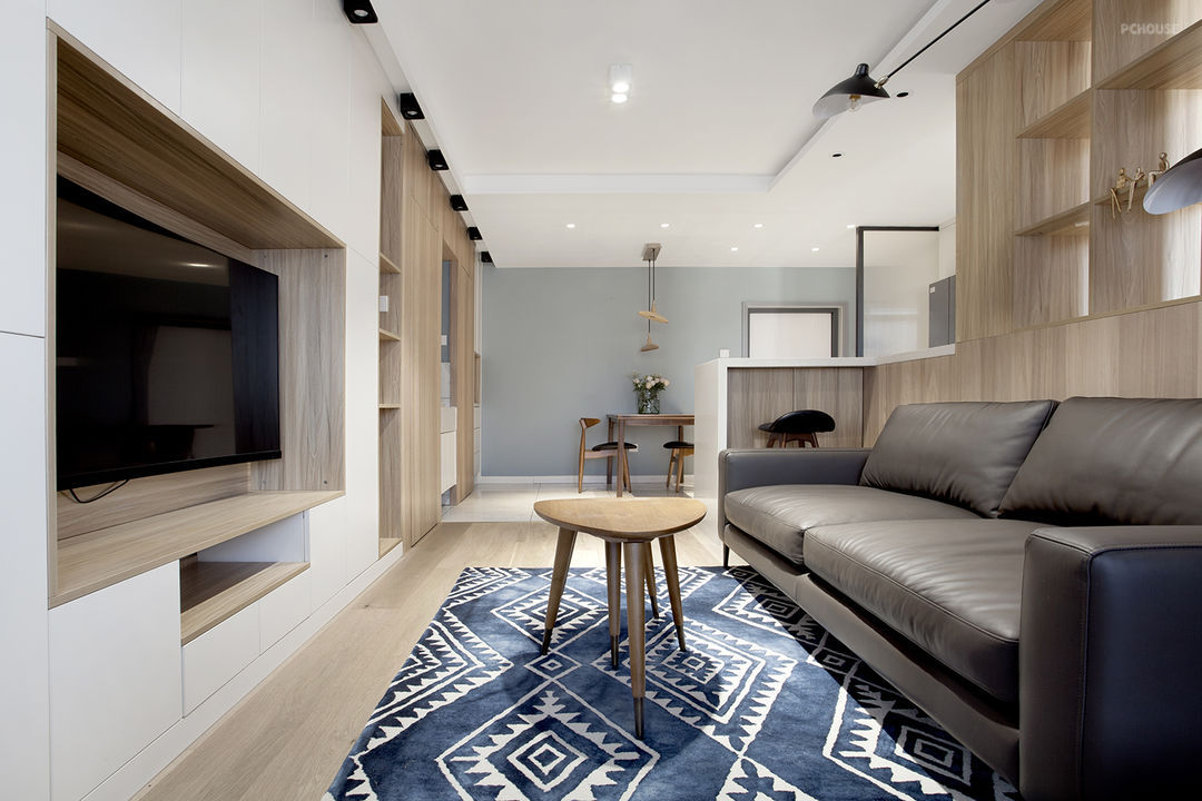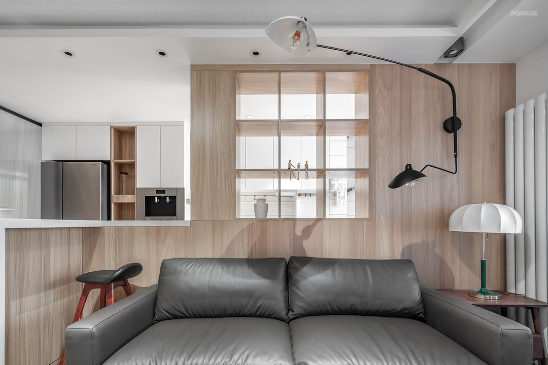 双人的头层皮沙发选自Norhor,依靠吧台的摆放,让坐在上面的人更有一种被围合的依赖感。透过开放格,可以直接窥视到对面厨房的烟火气。围绕沙发的橱柜+吧台+书柜组合,用了3张饰面板做铺贴,选自科定板K6176AS。因为整板易弯,在现场与无基层的家具固定,显然是一件非常棘手的问题。所以在橱柜还没进场之前,就要把科定板带到厂家车间做加工。