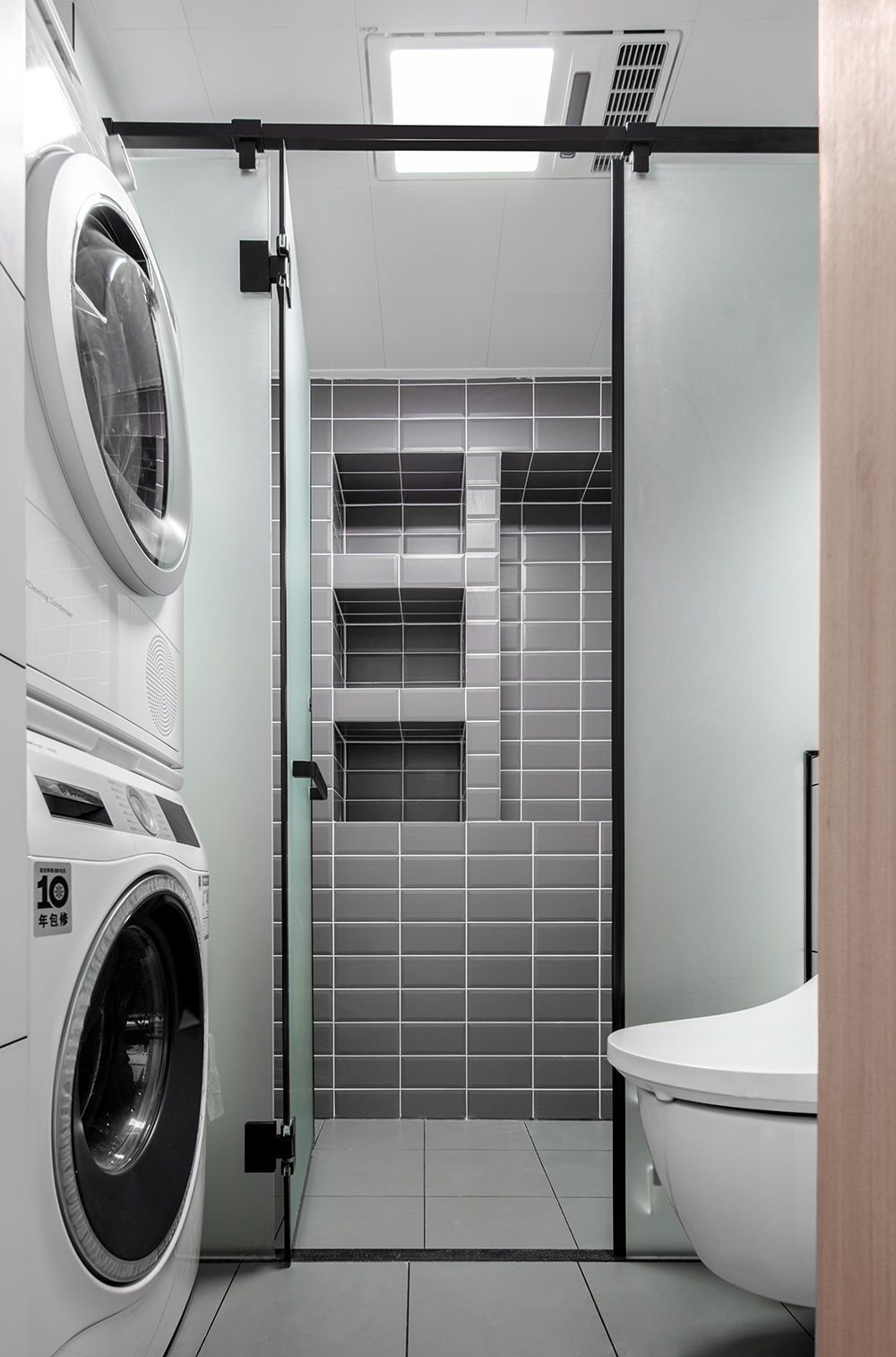 还是借助墙体被掏出来的部分,在卫生间里满足了洗衣机+烘干机的摆放。既不占用过道空间,还使多余的面积甚至是墙厚部分,都得到了利用。