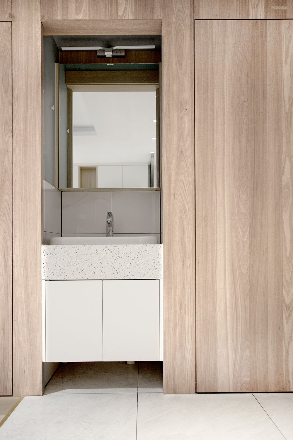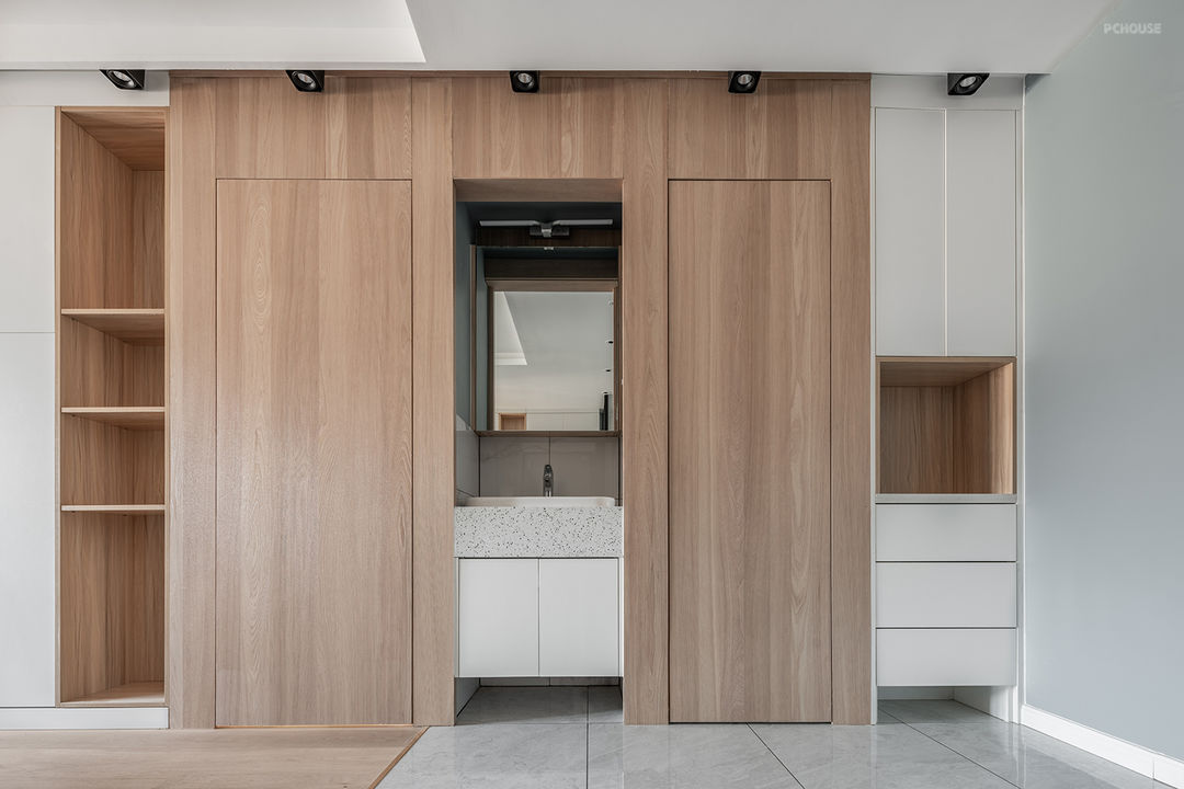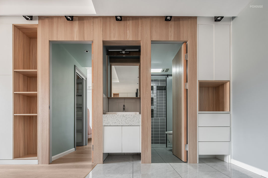 拆除的墙体,“掏”进了一段800mm的洗手柜,干湿分区也让里面的卫生间减少了不少负担。水磨石搭配白色柜板质感很好,在整墙的木色当中有一种留白的自然。镜前灯选择的是4000k色温,这样照镜子的感觉才更真实。