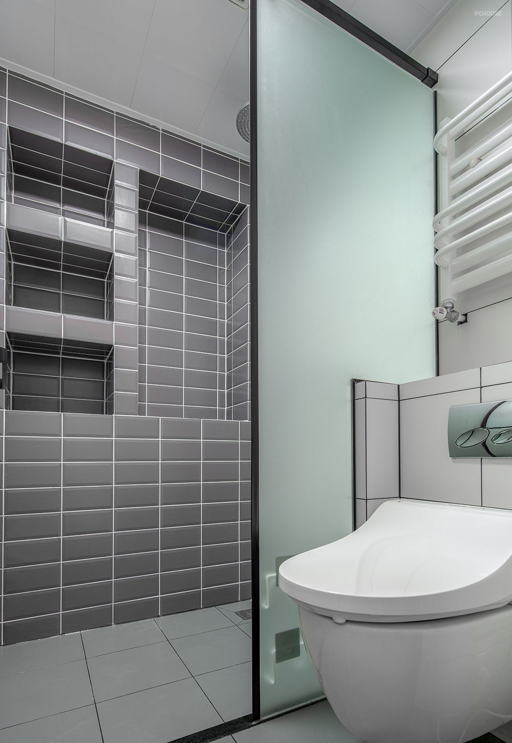 淋浴房是第二段空间,功能基本满足三分离的使用。规则的面包砖整齐对角,里面的壁龛承担收纳沐浴用品的责任,实用其实比装饰性更大。