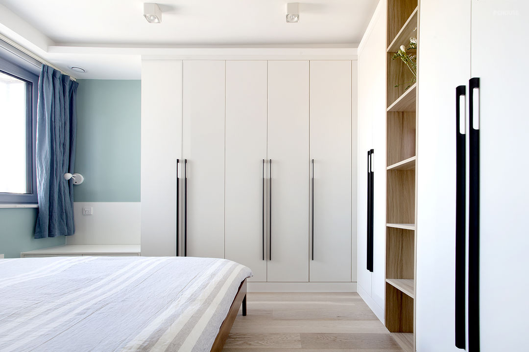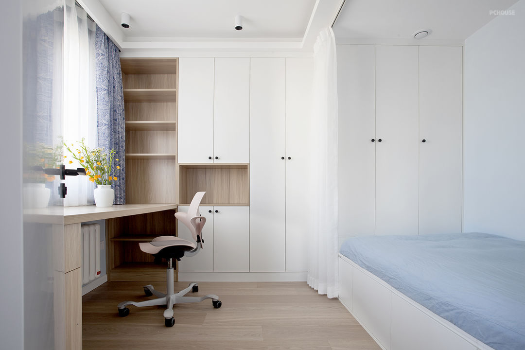 起初卧室储物量非常少,动线限制了大部分功能。我们更改了门的位置后,找了环绕收纳和床组搭配的最佳方式。围合动线的布置,解决了死角积灰不易清理的问题,衣柜和开放格的交错方式,也满足了不同形式的收纳。
