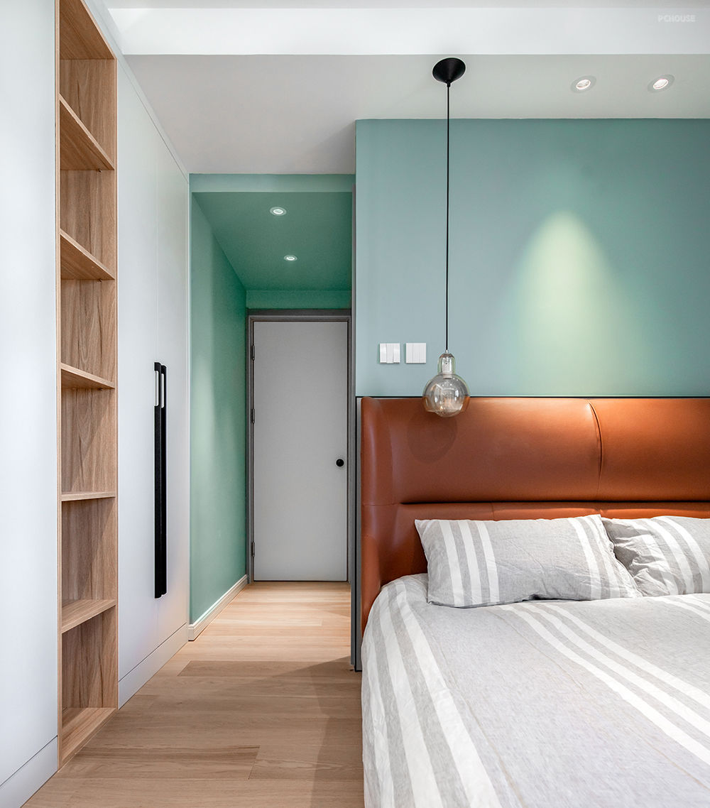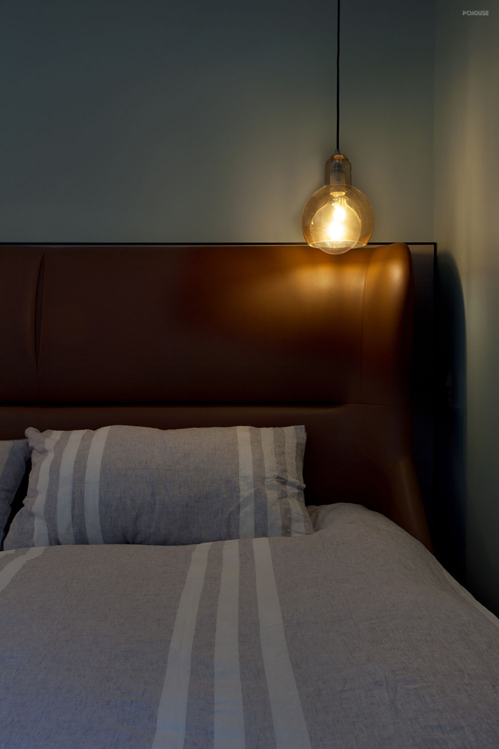 弱饱和的绿色调,搭配皮质深栗色床头软包,一种清新明快,一种沉寂安逸。留给床头的面积微乎其微,只有从顶上悬吊下来的小吊灯,是Rebea睡前夜读时最大的满足。