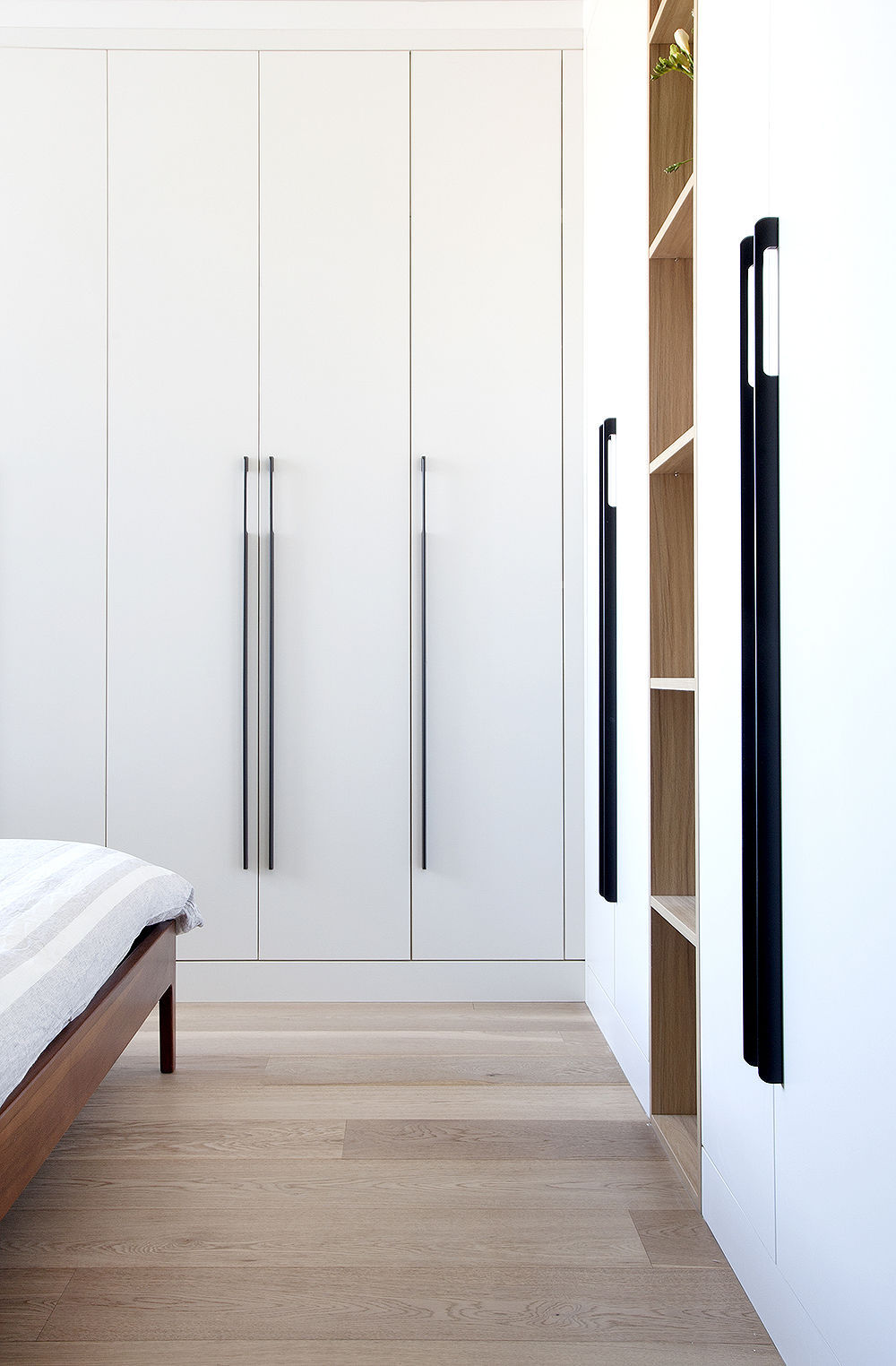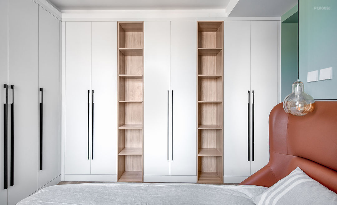 简单干净的折角平板柜,足足有5100mm的延长尺寸,充分发挥卧室最大的收纳容积量,可以把MrWrong一家所有的衣物全部塞到里面。